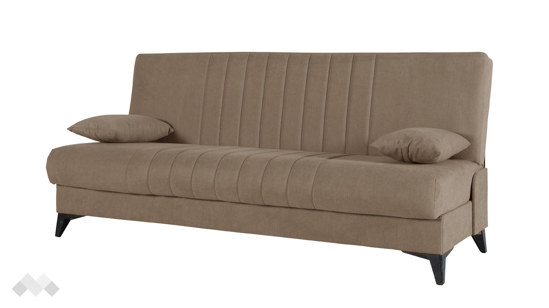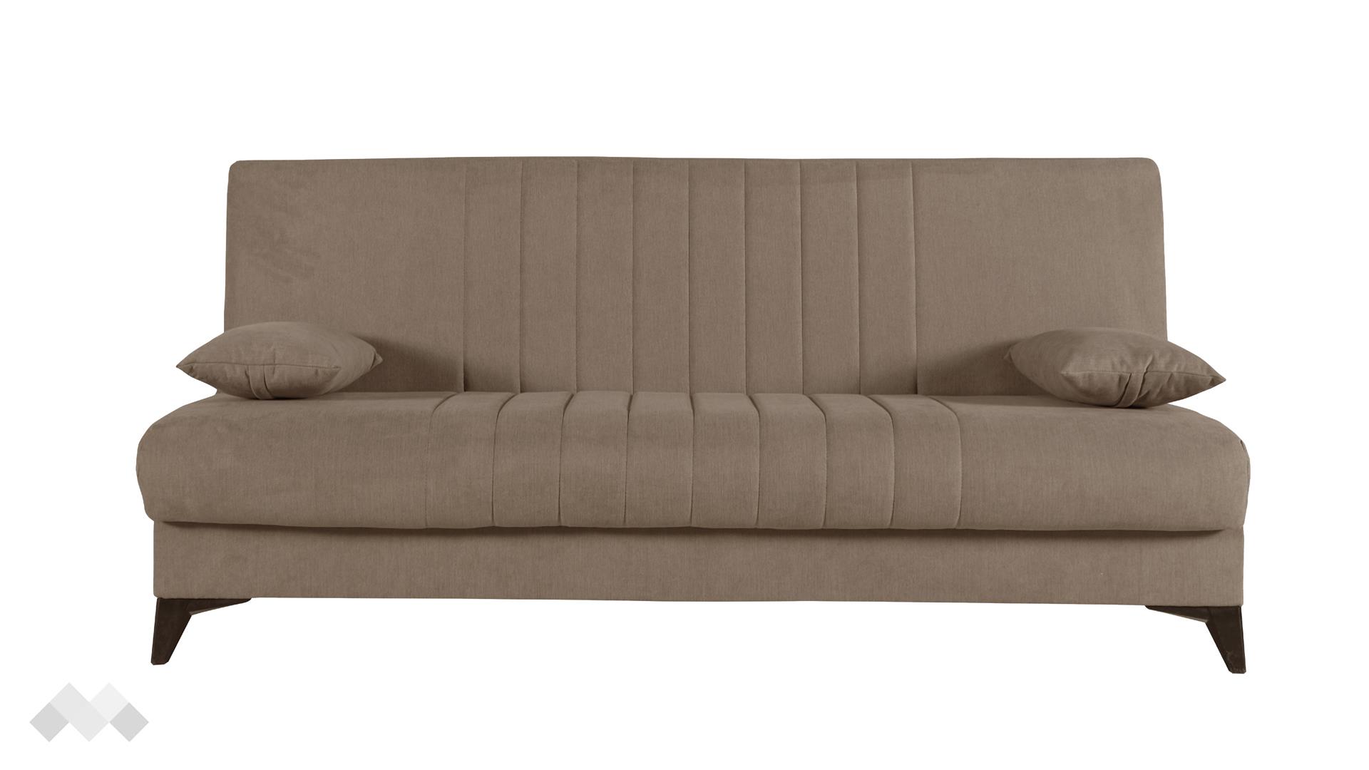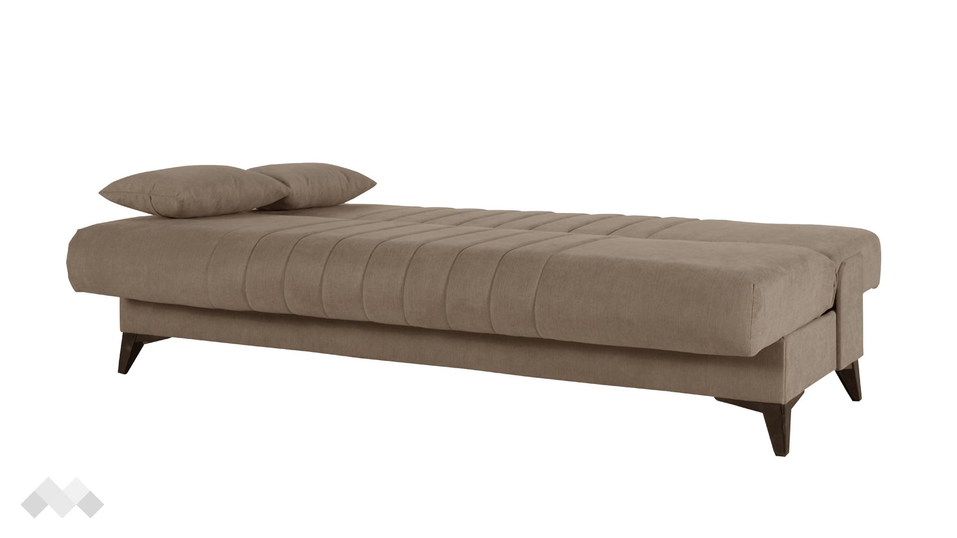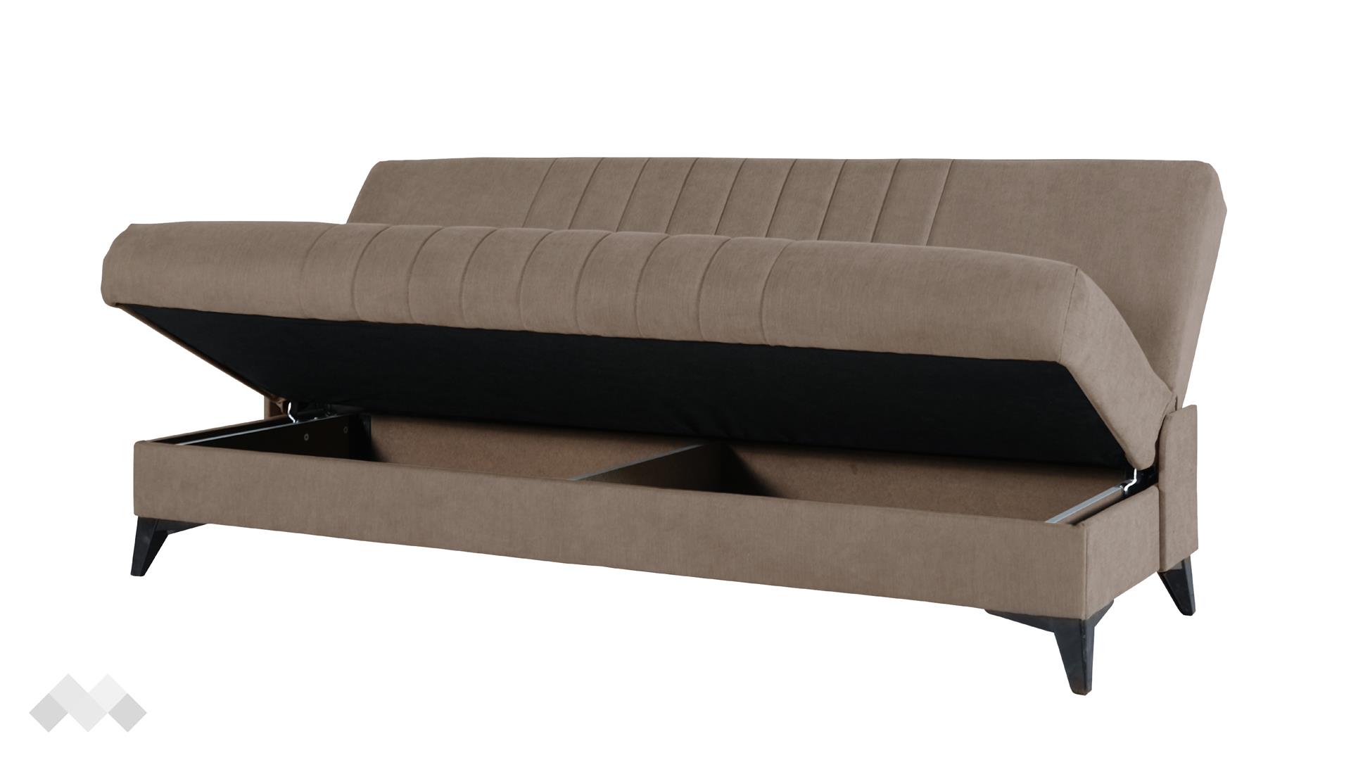 Подлакътниците са оформени с възглавници, които лесно се отстраняват при нужда, за да разширят използваемата площ. Това прави канапето още по-функционално и удобно при посрещане на гости или при необходимост от кратка почивка през деня. Просторната ракла под седалката осигурява допълнително място за съхранение на спално бельо, завивки и други вещи.
