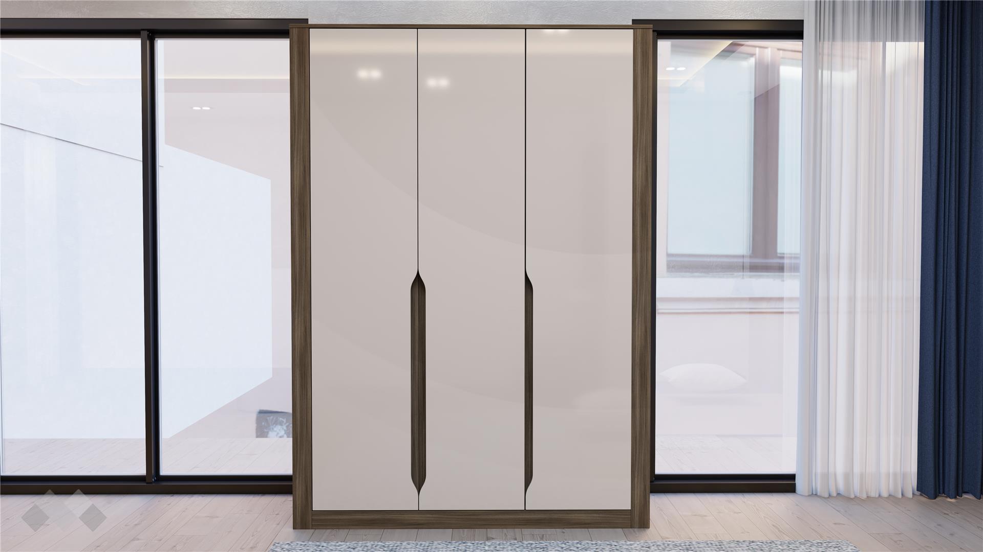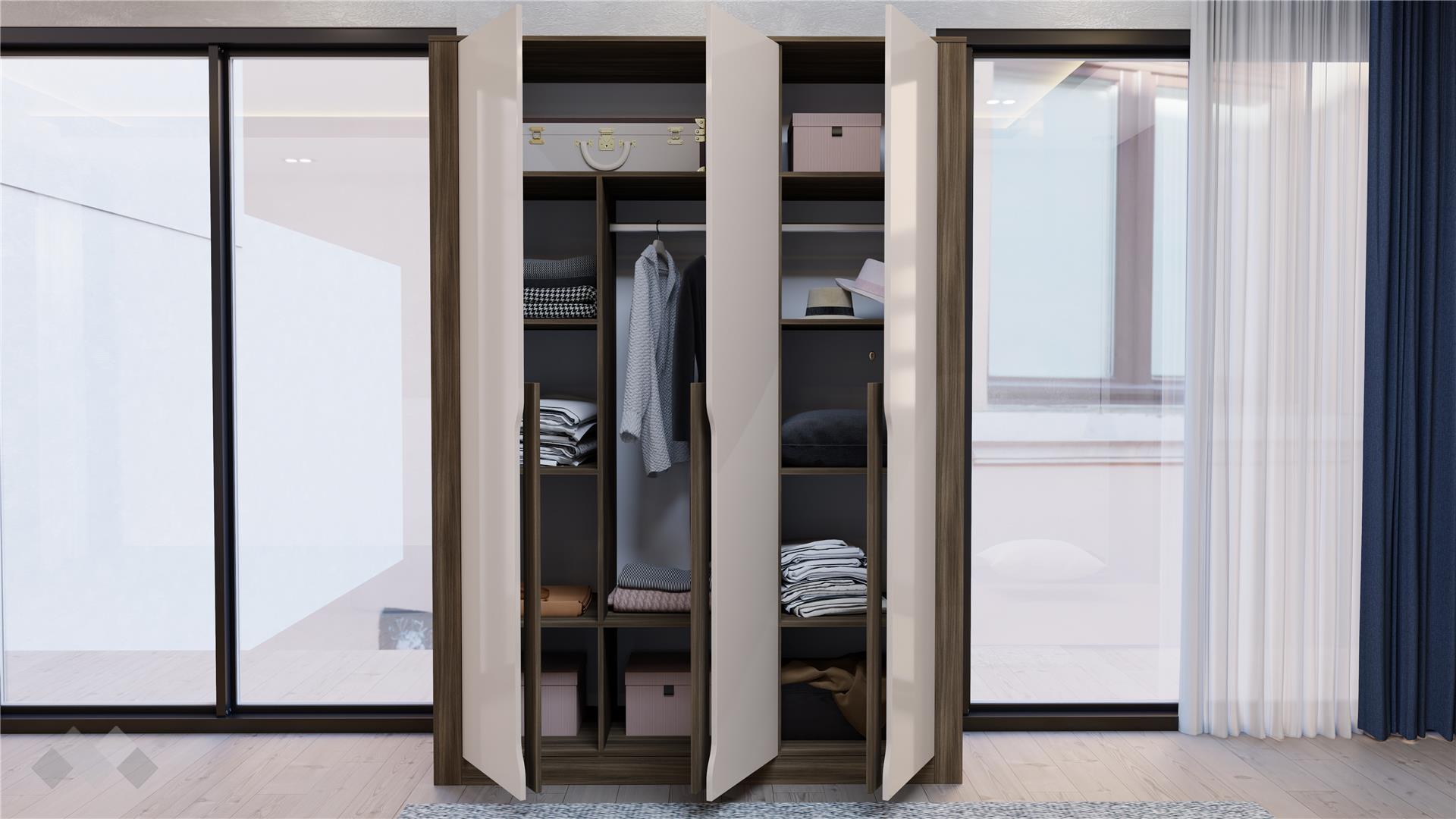 Трикрилният гардероб впечатлява с височина 220 см и предлага добре организирано вътрешно пространство за съхранение. Със своята дълбочина, рафтове и лост за закачалки, той позволява подредено и удобно прибиране на дрехи и аксесоари.