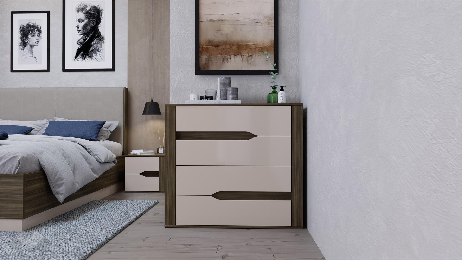 Скринът с четири чекмеджета е изключително практичен за съхранение на дрехи, спално бельо и лични вещи. Чекмеджетата са снабдени с телескопични водачи, които позволяват плавно и пълно изтегляне, гарантирайки удобство и надеждност в дългосрочен план.