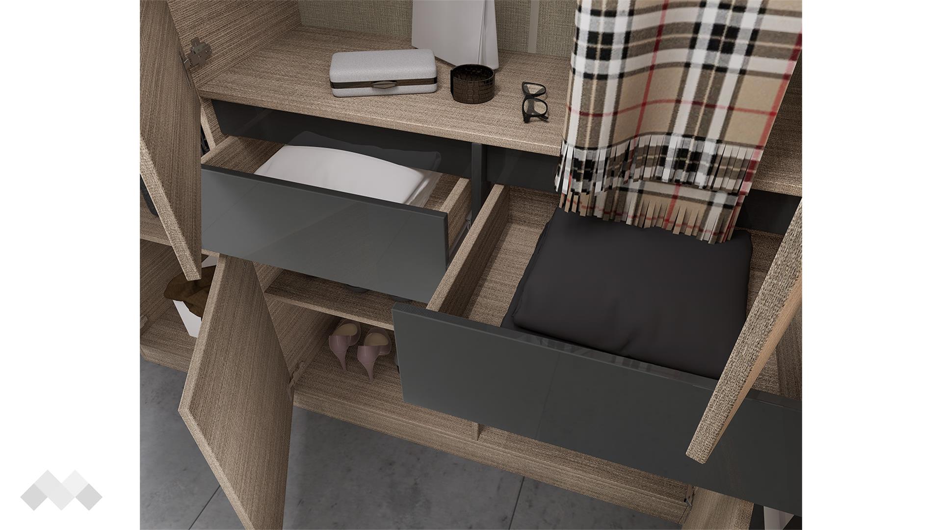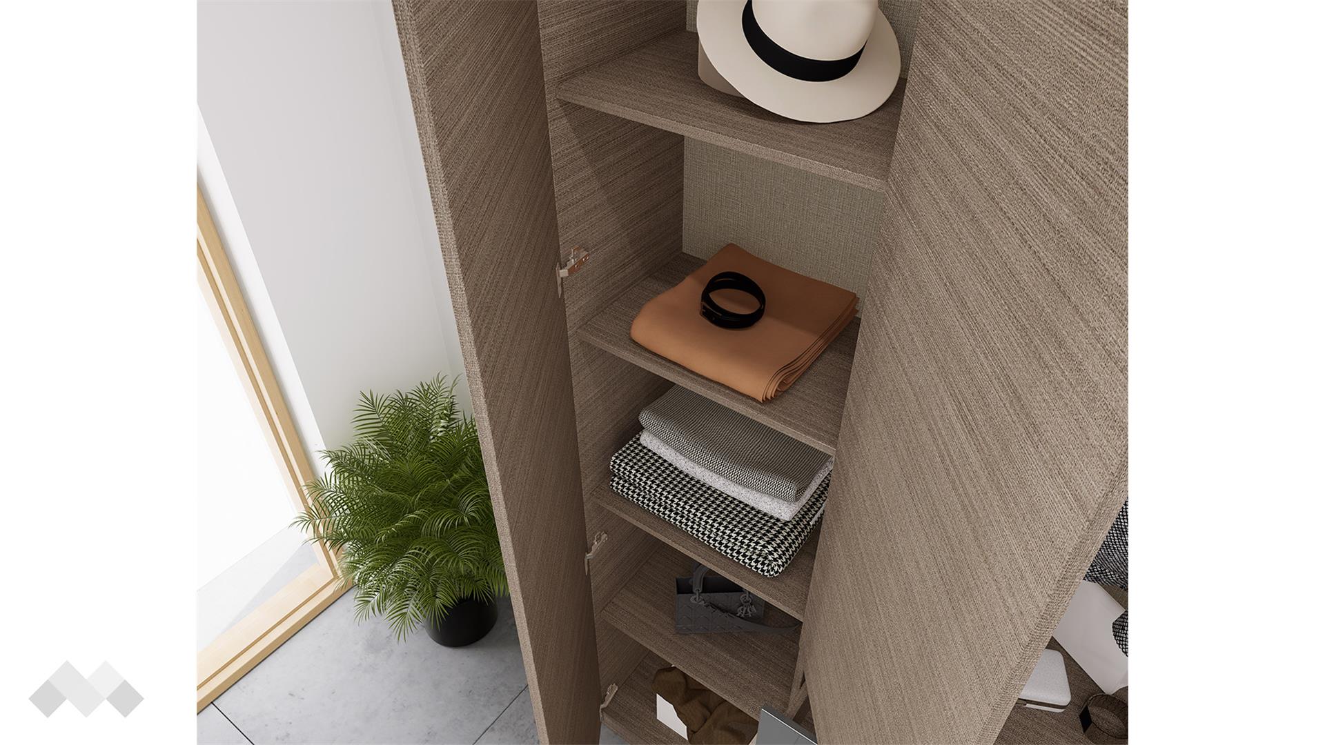 Моделът разполага с висок шкаф с огледала на вратата за да си сигурен, че изглеждаш перфектно имаш и огледало, на което можеш да хвърлиш последен поглед на външния си вид преди да излезеш. На петте рафта скрити зад нея имаш достатъчно място за съхранение на своите вещи.