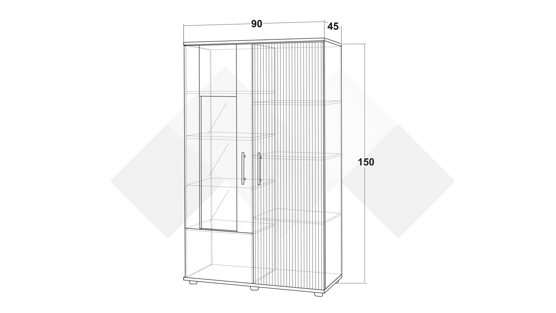 Левият модул на двукрилния шкаф е със стъклена врата, зад която са разположени четири рафта, идеални за излагане на декоративни елементи, сервизи или напитки. Десният модул е с плътна врата зад която ще откриеш три рафта, осигуряващи място за книги или други вещи, които искате да съхранявате прибрани.