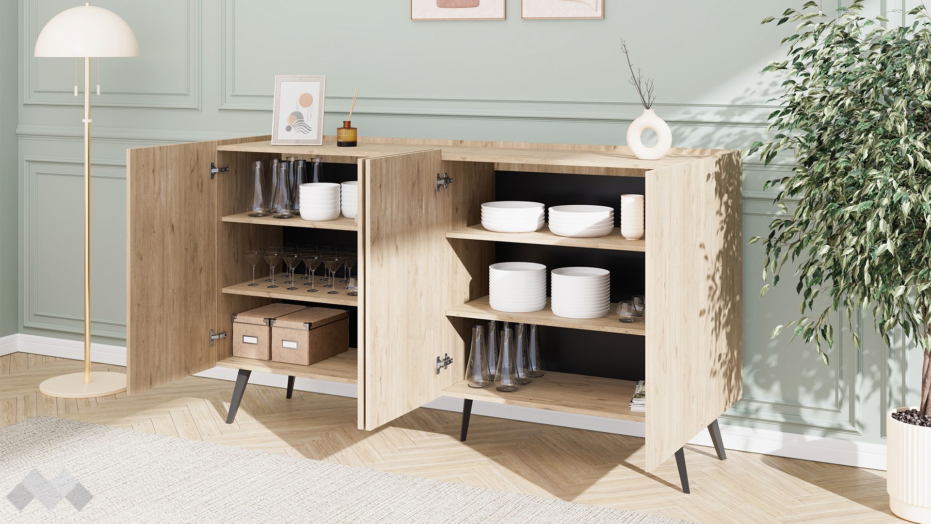 Скринът разполага с два затворени шкафа с по два вътрешни рафта всеки, предоставяйки достатъчно място за съхранение на домакински съдове, чаши и аксесоари, кутии за съхранение, лични вещи, козметика или други необходими за теб неща. Благодарение на вътрешните рафтове можеш лесно да разделиш вещите си и да поддържаш реда, като всяко нещо има своето място.