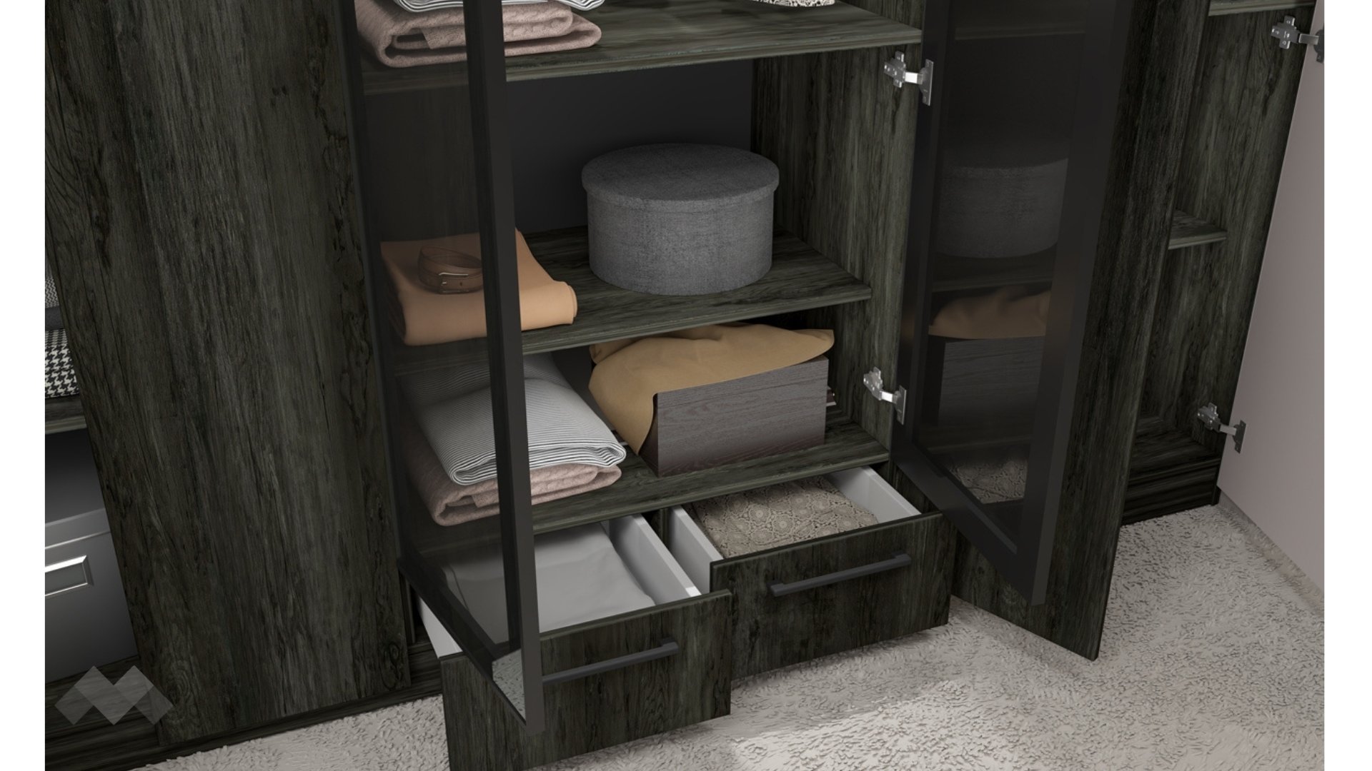 Моделът разполага с шест рафта, на които можеш да поставиш спално бельо, сгънати дрехи и кутии за съхранение на по-дребни вещи, както и с три лоста за закачалки, на които ще намериш място за елегантните си тоалети. Различното в декора на гардероб Лондон е при средните две крила, които са с алуглас врати, а лостът за закачалки отвътре е с LED осветление.