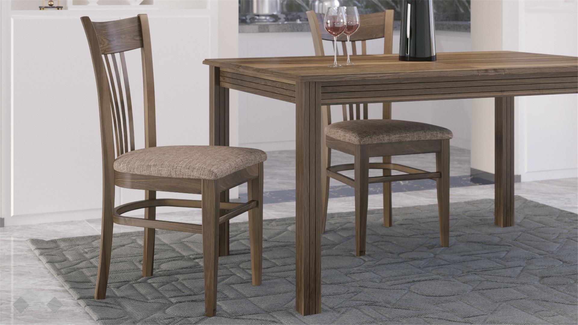 Столът е със здрава конструкция от естествена букова дървесина за устойчивост и стабилност, а лаковото покритие добавя елегантност. Седалката е проектирана с твърда основа, тапицирана с дунапрен за повече комфорт при седене и завършена със здрава текстилна дамаска, лесна за поддръжка.