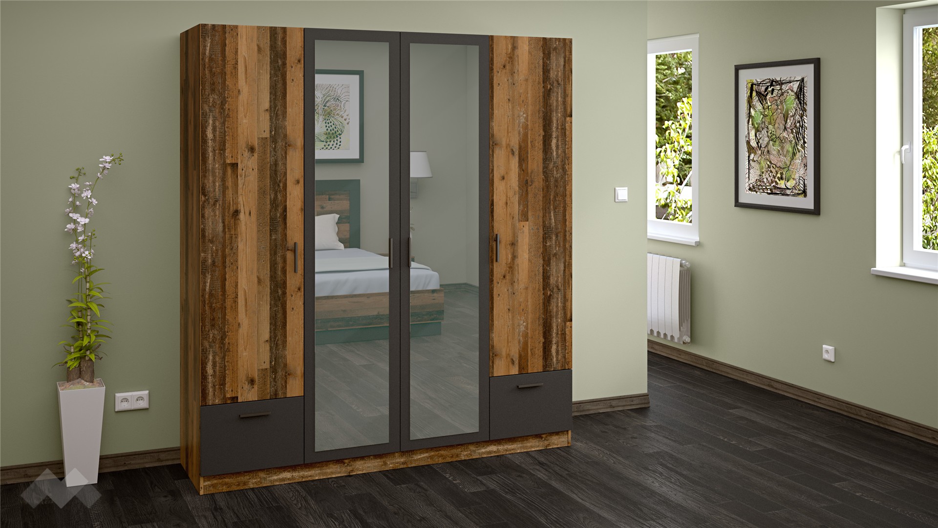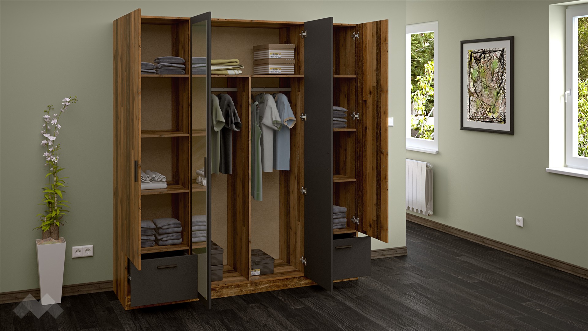 Гардеробът е четирикрилен, практично разпределен и изцяло отговарящ на съвременните стандарти за съхранение на дрехи. На твое разположение са 7 рафта, където можеш да подредиш сгънати дрехи, завивки, аксесоари, кутии за съхранение или други необходими вещи. В средната част ще откриеш и два лоста за закачалки, подходящи за елегантното облекло, което се мачка много лесно, като ризи, рокли, сака и други. Благодарение на двете чекмеджета разполагаш с достатъчно място за организация на аксесоари, чорапи, бельо или дребни електрически уреди. Ще ти допаднат и огледалата, разположени на вратите – те превръщат гардероба в незаменим помощник при избора на тоалет. Освен това, благодарение на тях стаята ще бъде по-осветена и ще изглежда визуално по-голяма.