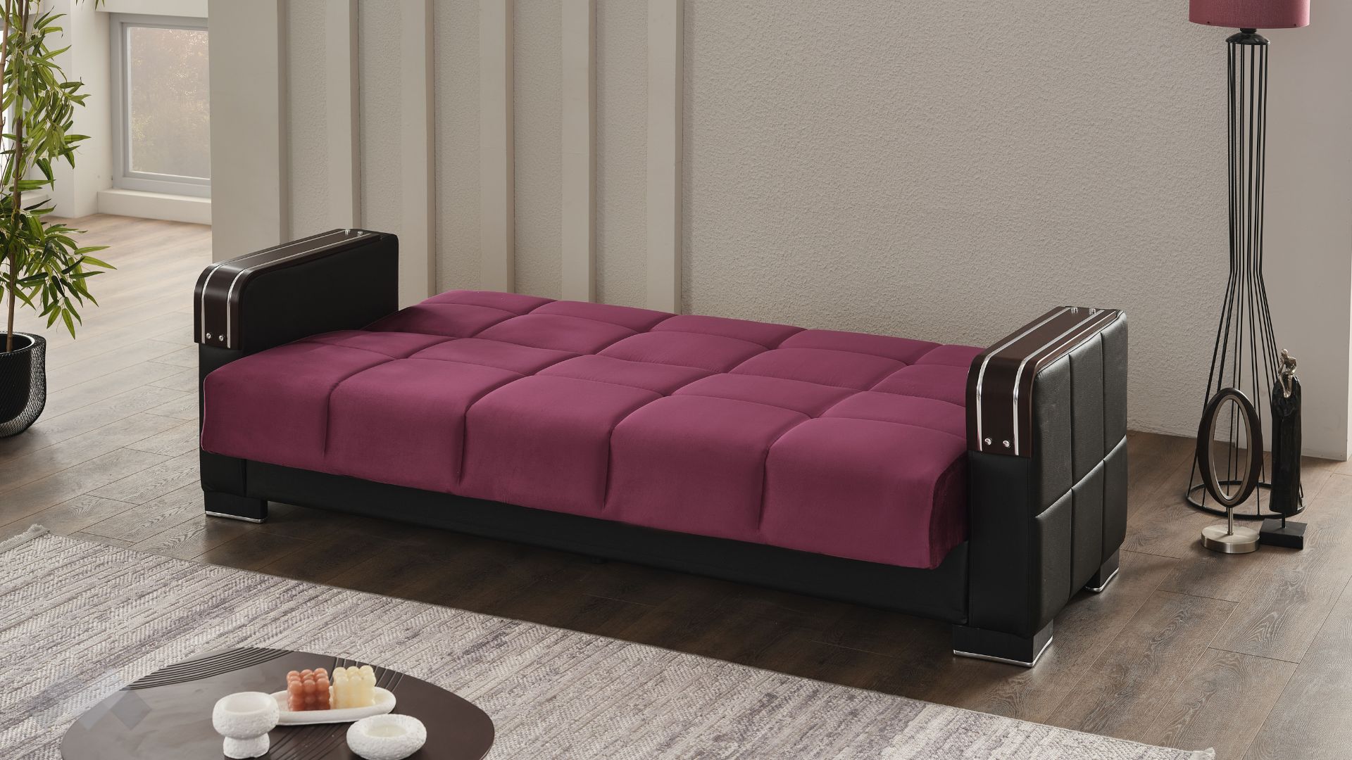 Диван Малатия е и функционален - благодарение на клик-клак механизма ще разполагаш с повече пространство за релакс - 112/190 см, а под седалката се крие удобна ракла, където да съхраняваш завивки, възглавници и други вещи. Дамаската е приятна на допир, изработена от здрав и устойчив текстил, а за още по изтънчена визия, подлакътниците са с покрити с матово-черна еко кожа.