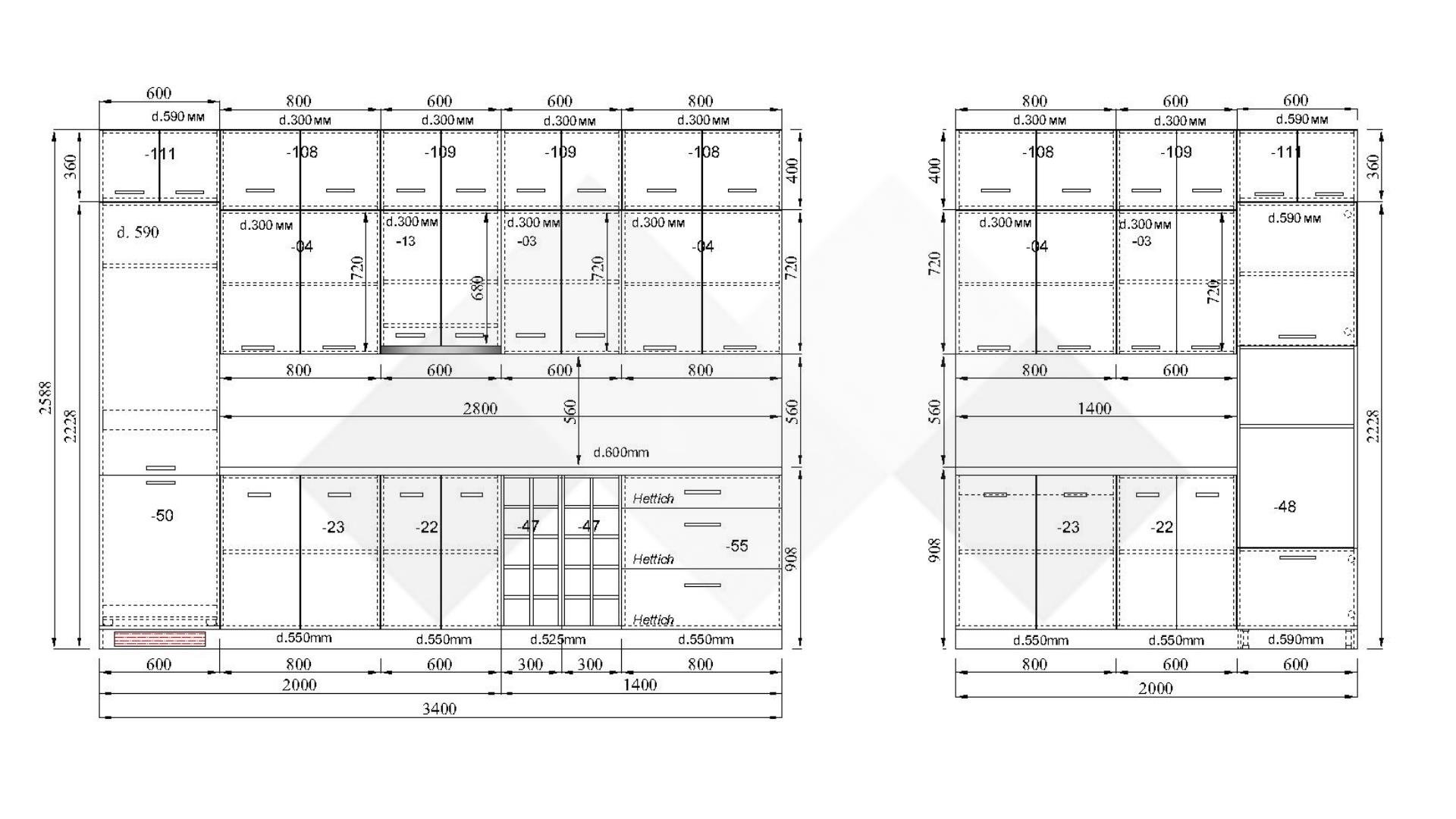 Горния ред шкафове са удобни и функционални, разделени на две - най-горните побират малко изполваните уреди и съдоведолните шкафове са просторни за най-често използваните уреди и посуда. Шкаф стандартен размер за вграждане на хладилник - за да бъде всичко в синхрон. Шкаф за вграждане на фурна и микровълнова. Етажерка за вино - за настроение в кухнята. Долния ред шкафове е функционално подбран - перфектната комбинация на рафтове и чекмеджета, за да поберат често използваните уреди, подправки и посуда.