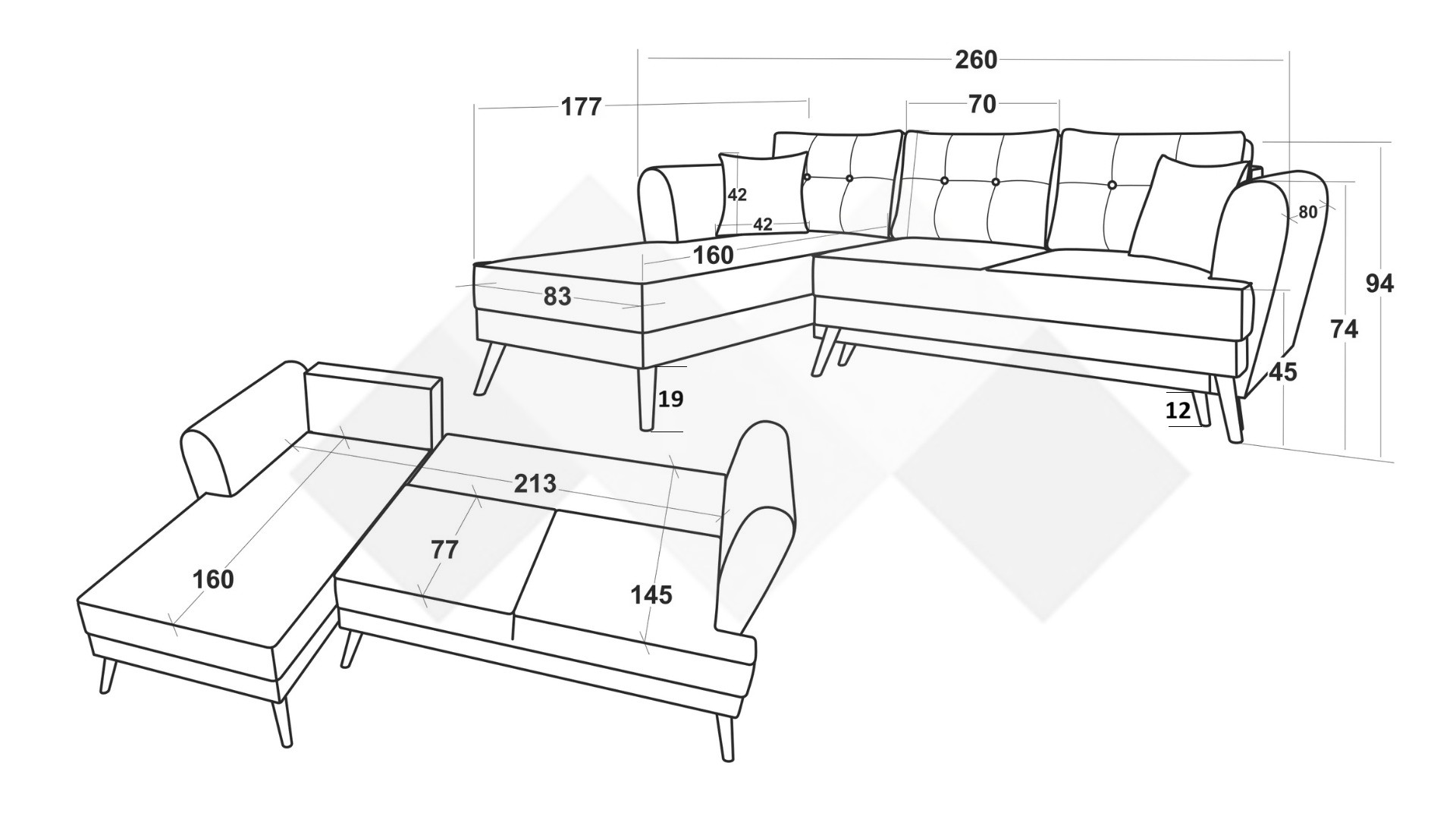 Д: 260 см Ш: 177 см В: 94 см