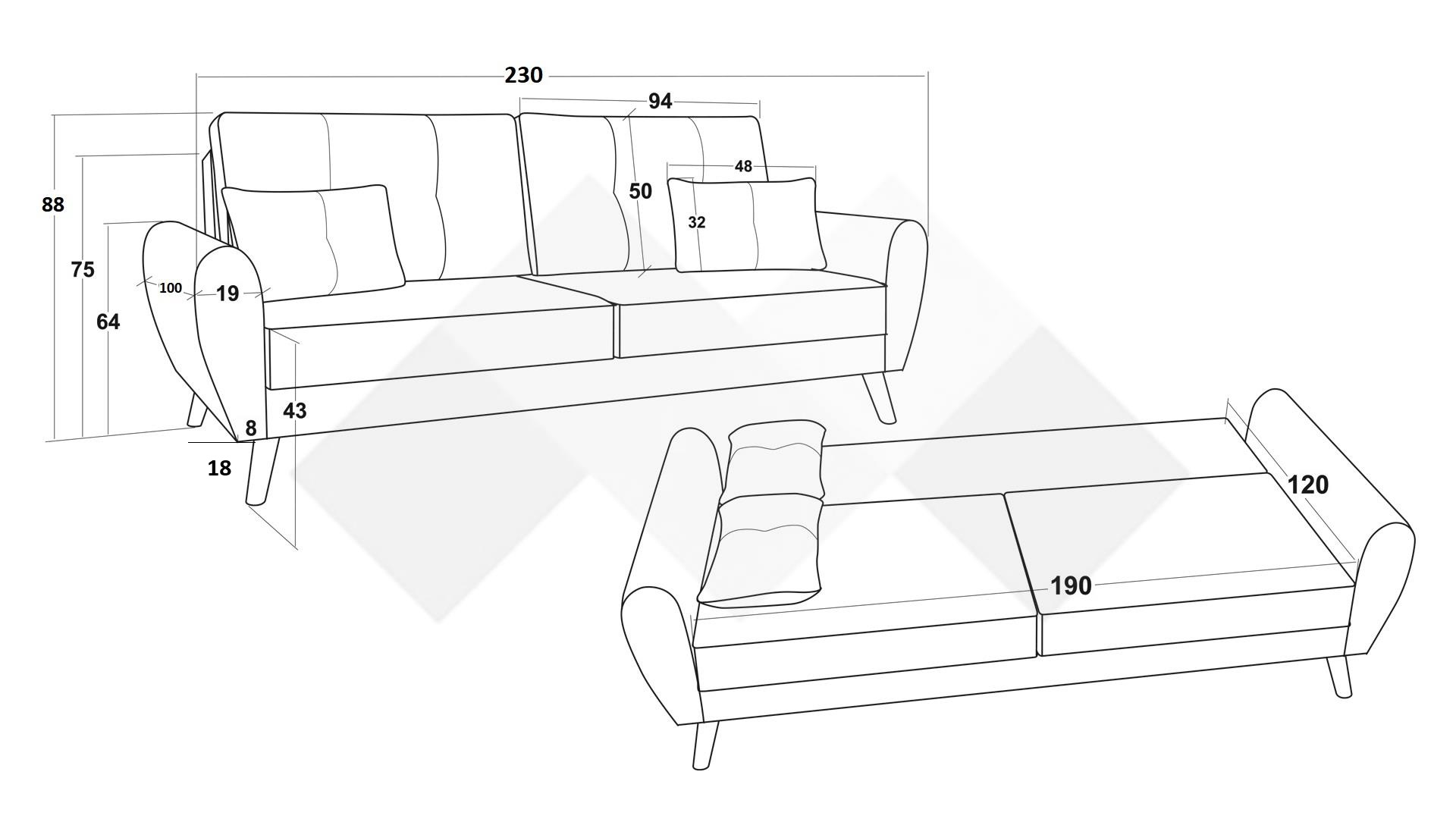 Триместен диван Мерива комбинира елегантна визия и функционалност, като предлага удобно място за сядане през деня и практична функция сън за нощта. Идеален избор за дневна, офис или гостна стая.