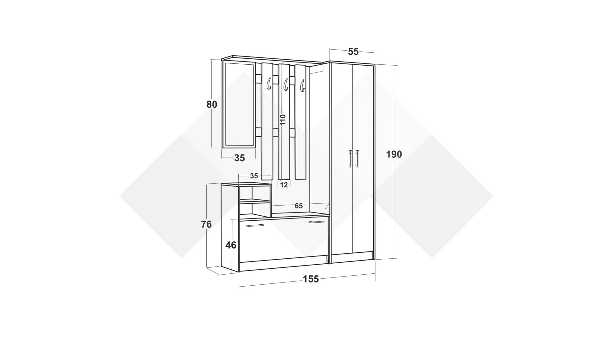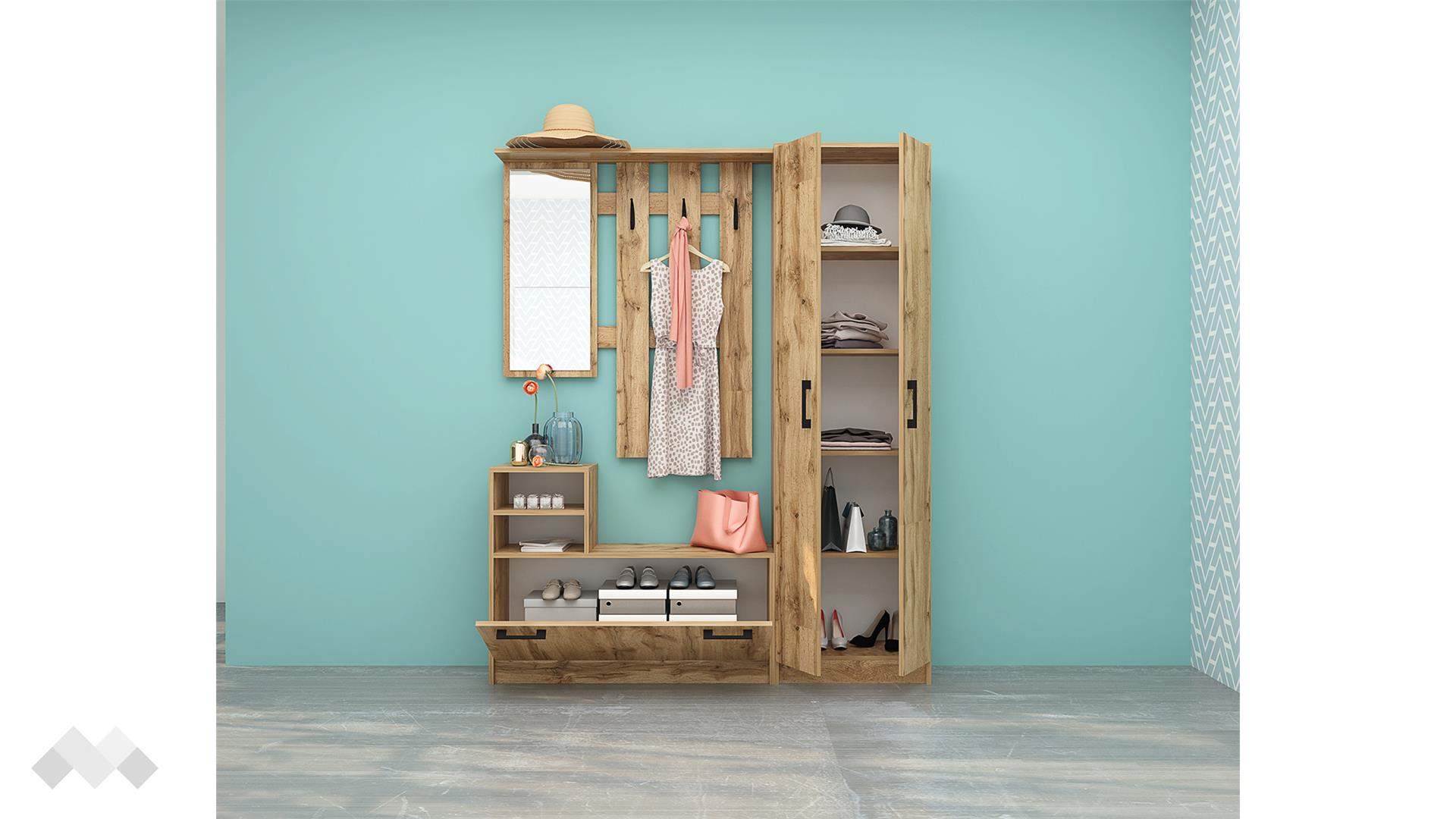 Двукрилният гардероб разполага с четири рафта, подходящи за организиране на дрехи, чанти, шапки, обувки и кутии за съхранение. Благодарение на двете отворени ниши и огледалото над тях, портмантото може да ти послужи и като тоалетка – в отворените пространства може да подредиш козметика, парфюми или други принадлежности. С лекота ще организираш най-често използваните обувки в шкафа с падаща врата, а горния плот е идеално място за твоите чанти. На паното са монтирани три здрави закачалки за якета, палта, шалове или шапки. Рафтът в горната част е удобен за малки кутии, аксесоари или други необходими за теб вещи.