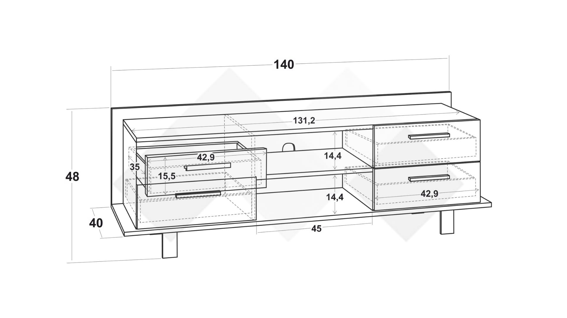 ТВ шкаф Модика се състои от 4 чекмеджета, рафт и удобен плот, на който можеш да поставиш своя телевизор. Рафтът в средата е чудесно място за любимите ти книги, сувенири и декорации. В чекмеджетата можеш да организираш всички вещи, които искаш да останат скрити, или техника, която не използваш толкова често, но в същото време ще ти е винаги под ръка.