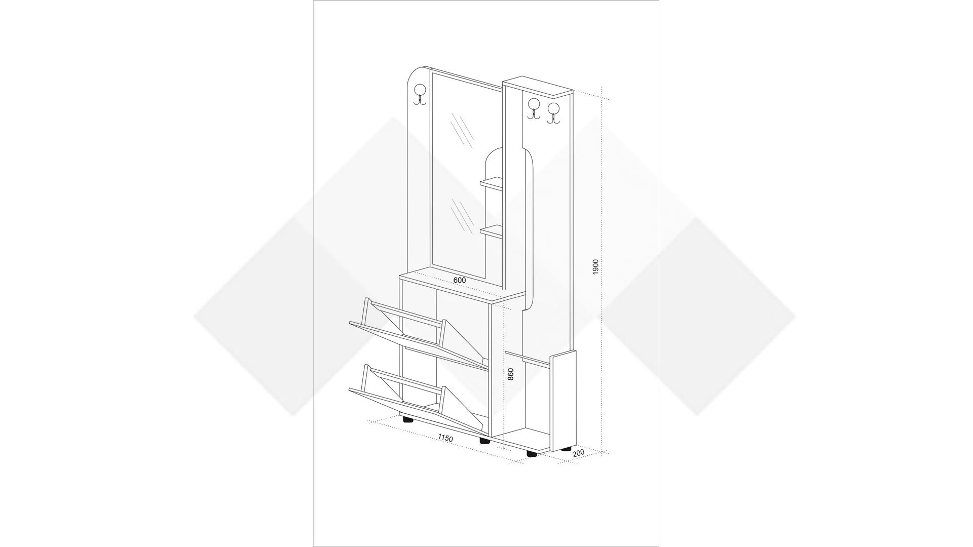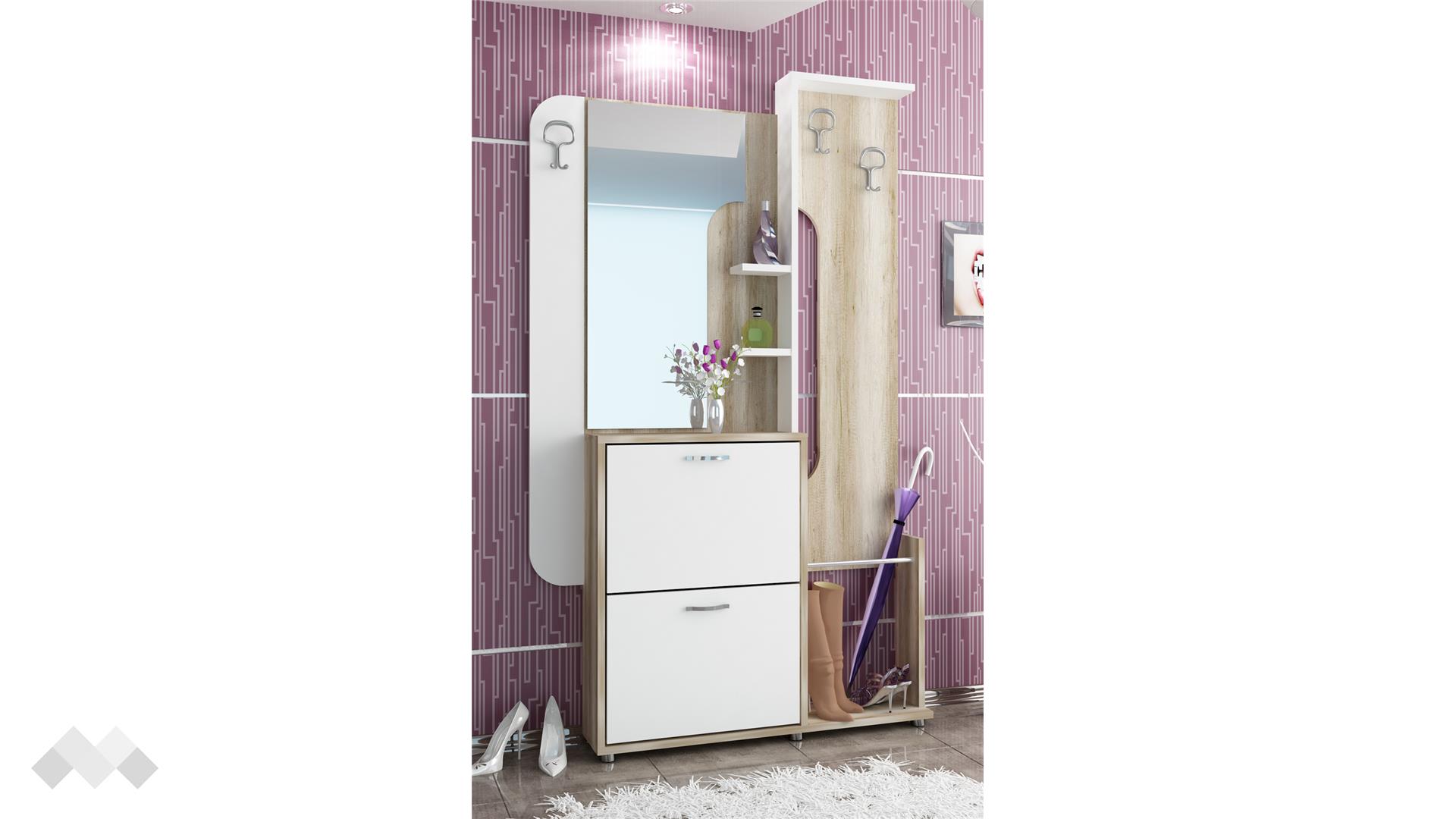 Разполага с два широки шкафа за обувки с падащи вратички с единични поставки, в тях можеш спокойно да организираш всичките си обувки. Плотът над тях и допълнителните две рафтчета са удобно място за козметика, парфюми или стилни декорации и украси. Това, което истински ще ти допадне, е голямото огледало, благодарение на което да хвърлиш бърз поглед на тоалета си преди излизане и да изпипаш всеки детайл по него.