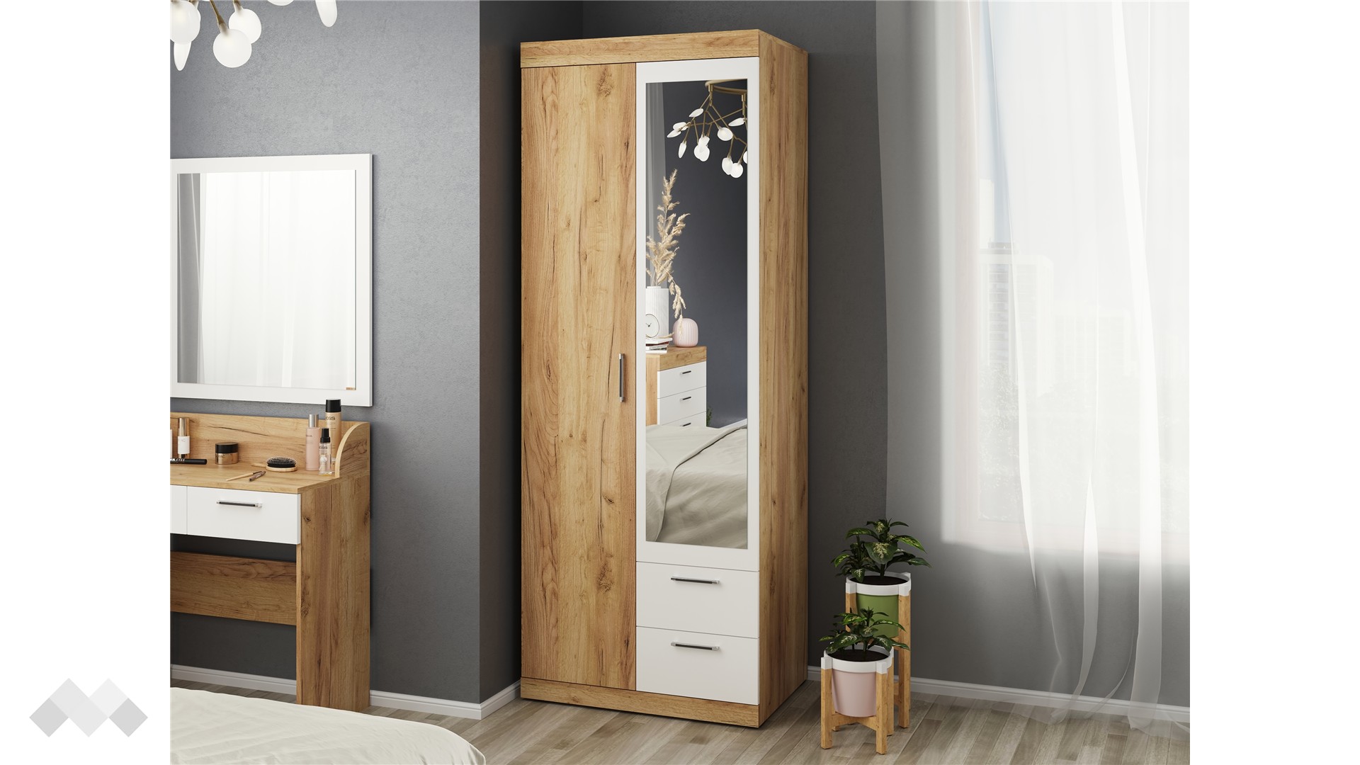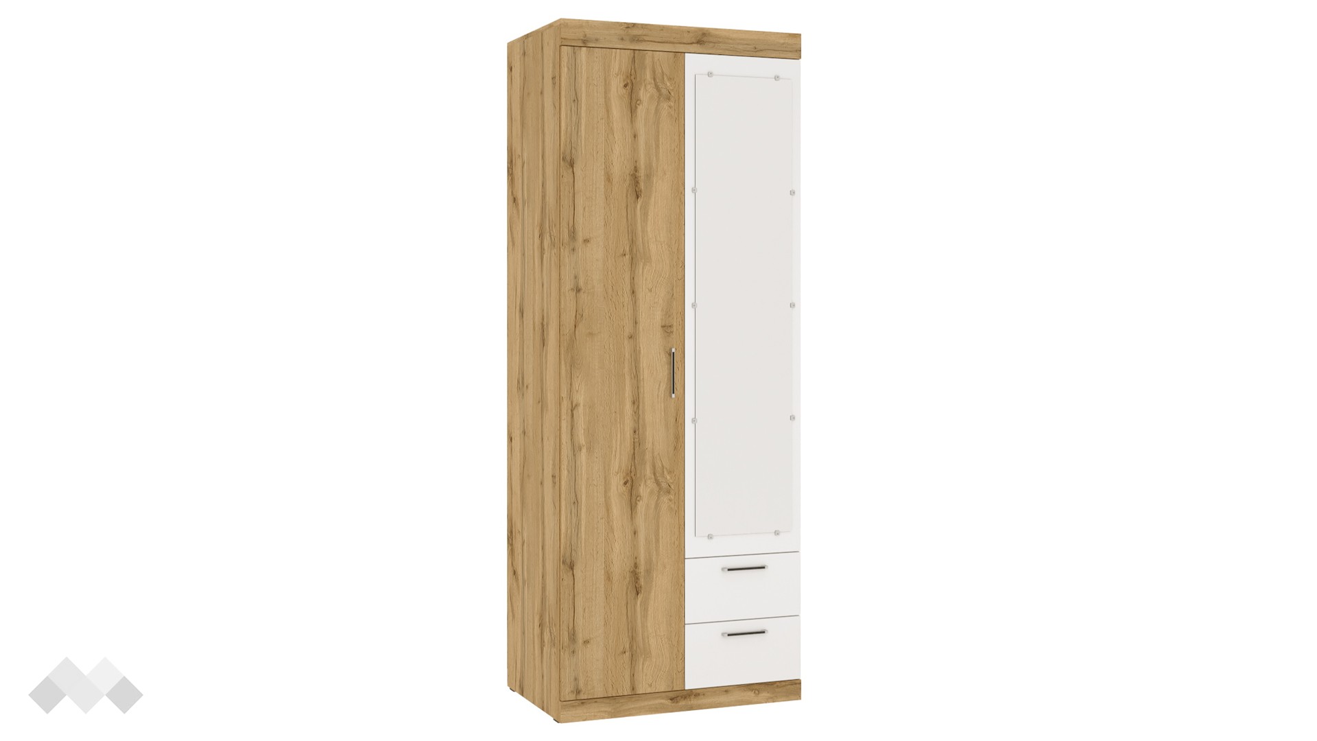 Благодарение на практичното разпределение на вътрешното пространство, с лекота ще можеш да организираш и съхраняваш дрехите си, като същевременно ще имаш бърз достъп до всеки тоалет. В двете чекмеджета е удобно да съхраняваш бельо, чорапи или други аксесоари. Комбинацията от рафтове и лост за закачалки ти дава възможност да организираш дрехите си по най-удобния за теб начин.