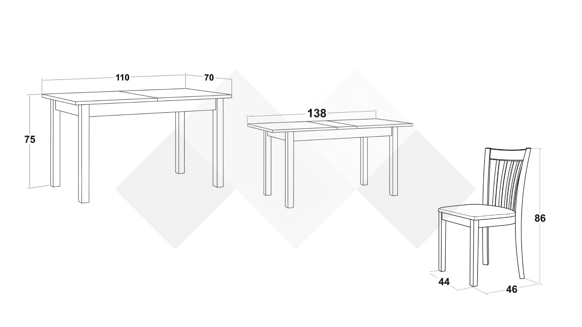 Трапезен комплект Нати М разполага с маса с дължина 110 см и 4 стола. Комплектът е изработен от масивна дървесина. А когато се нуждаеш от повече място, масата се разтяга до 138 см. Столовете са също толкова здрави и стабилни. Седалната част е достатъчно мека, за да ти е комфортно и в същото време удобно за хранене.