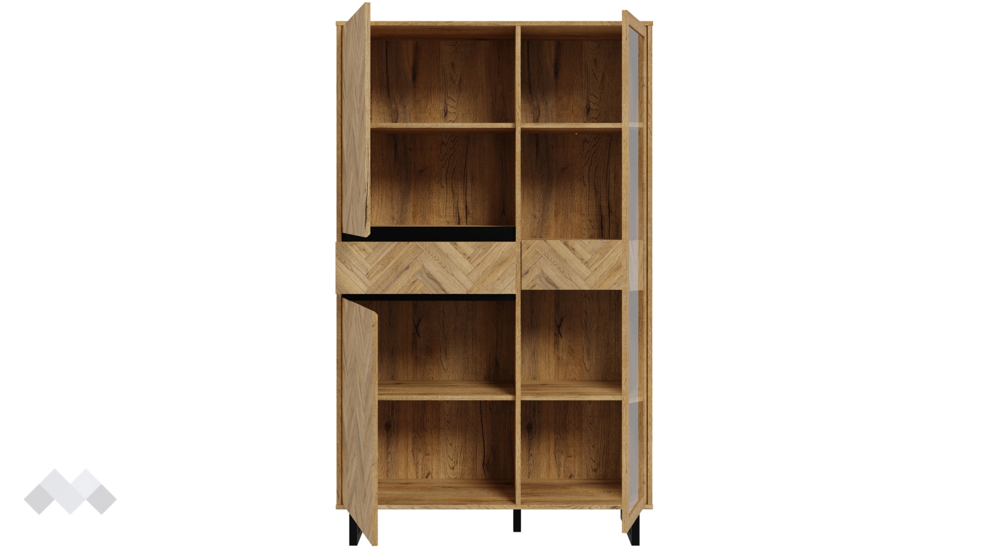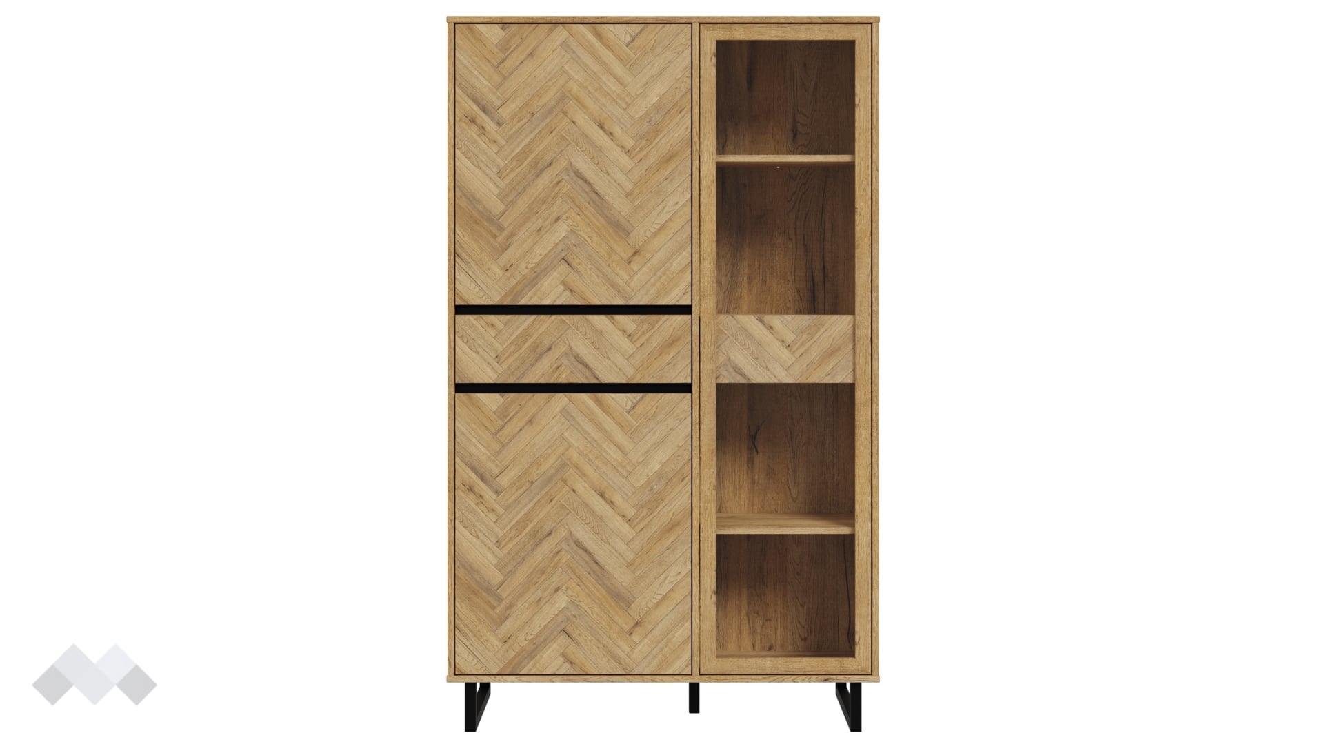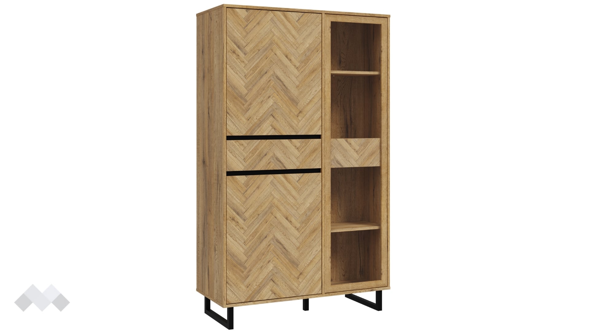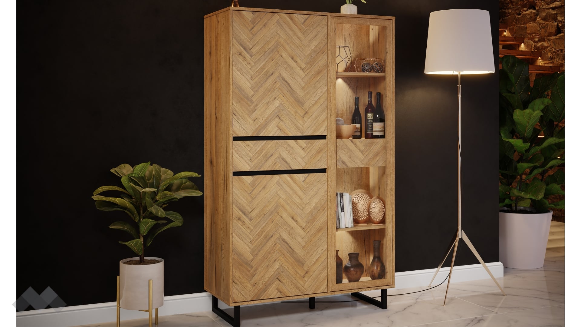 Висок шкаф с витринаНикодисдъб натурал с черен мат и житен дъб с витрина