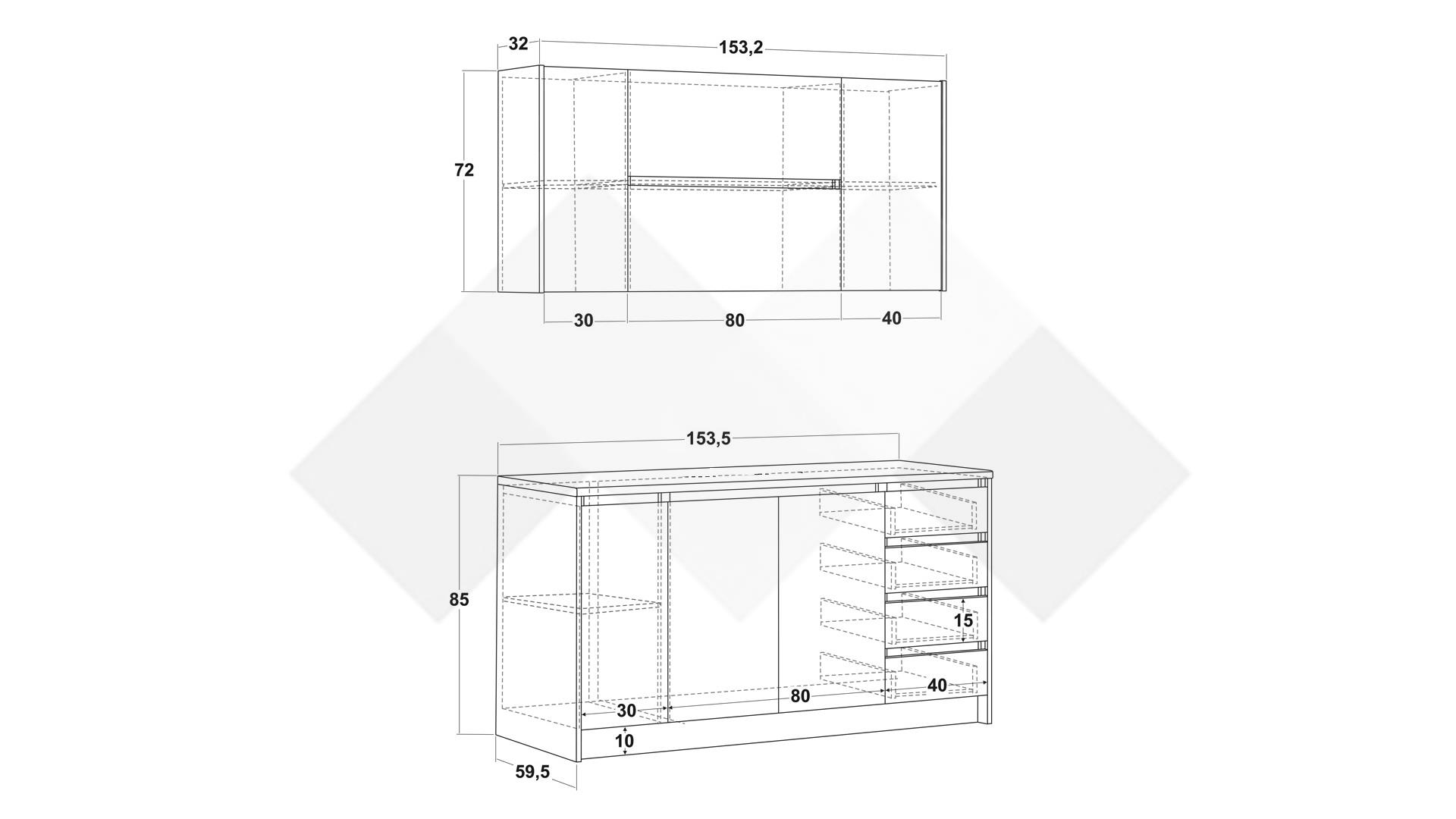 Горен модул: Д: 153,2 см. Ш: 32 см. В: 72 см.
