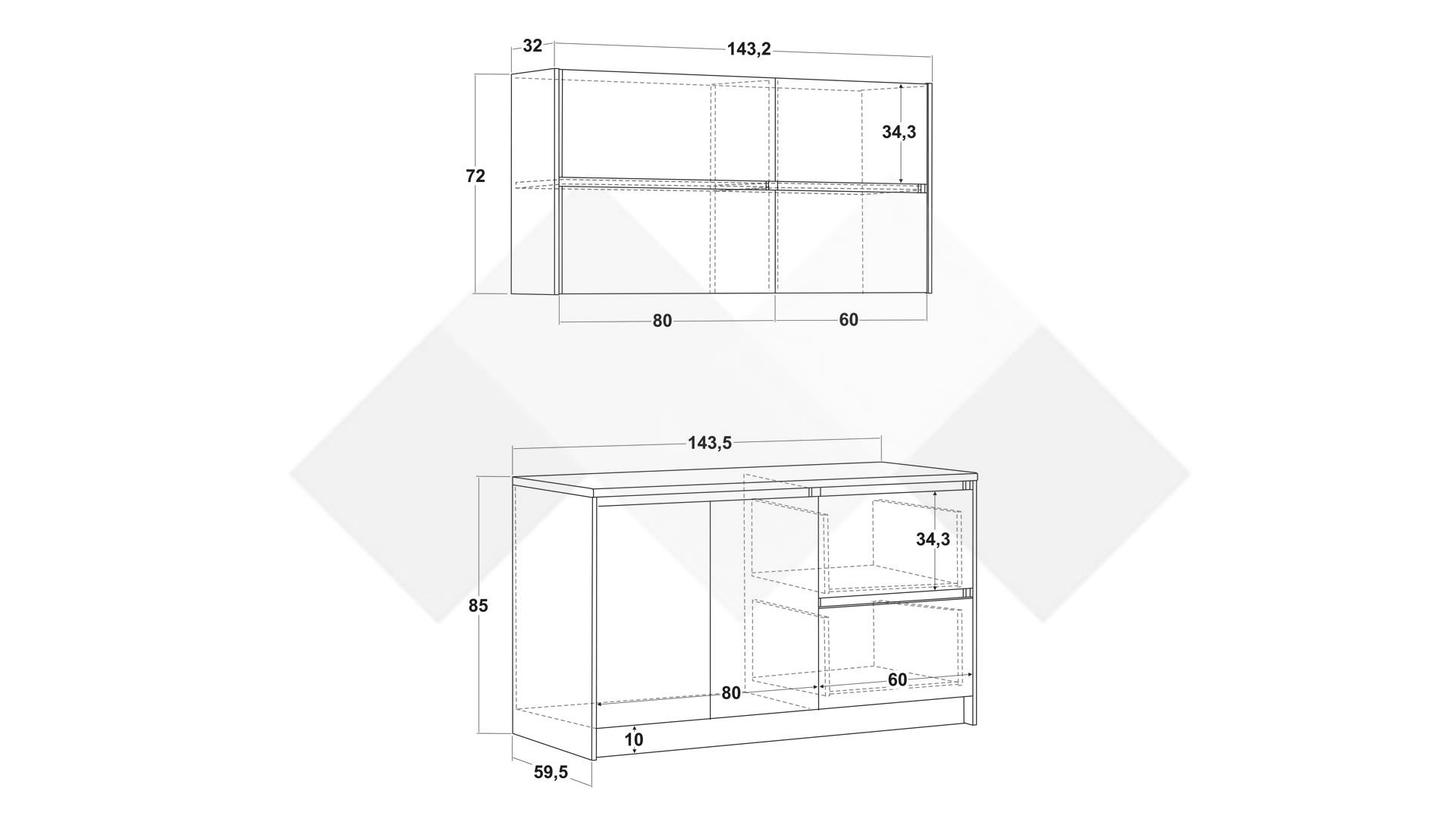 Горен модул: Д: 143,2 см. Ш: 32 см. В: 72 см.