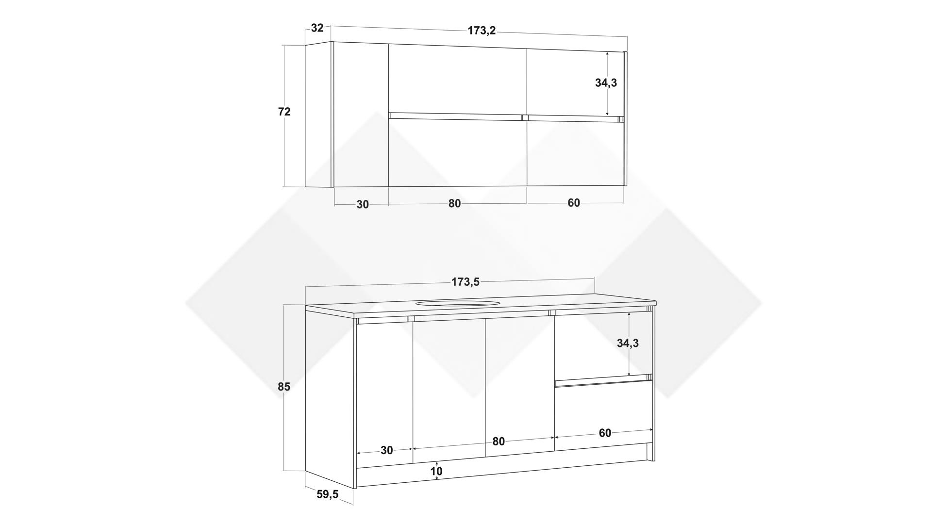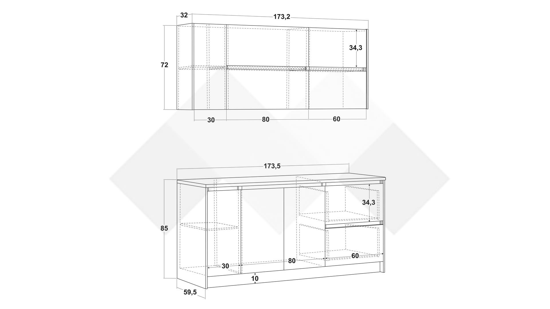 Горен модул: Д: 173,2 см. Ш: 32 см. В: 72 см.
