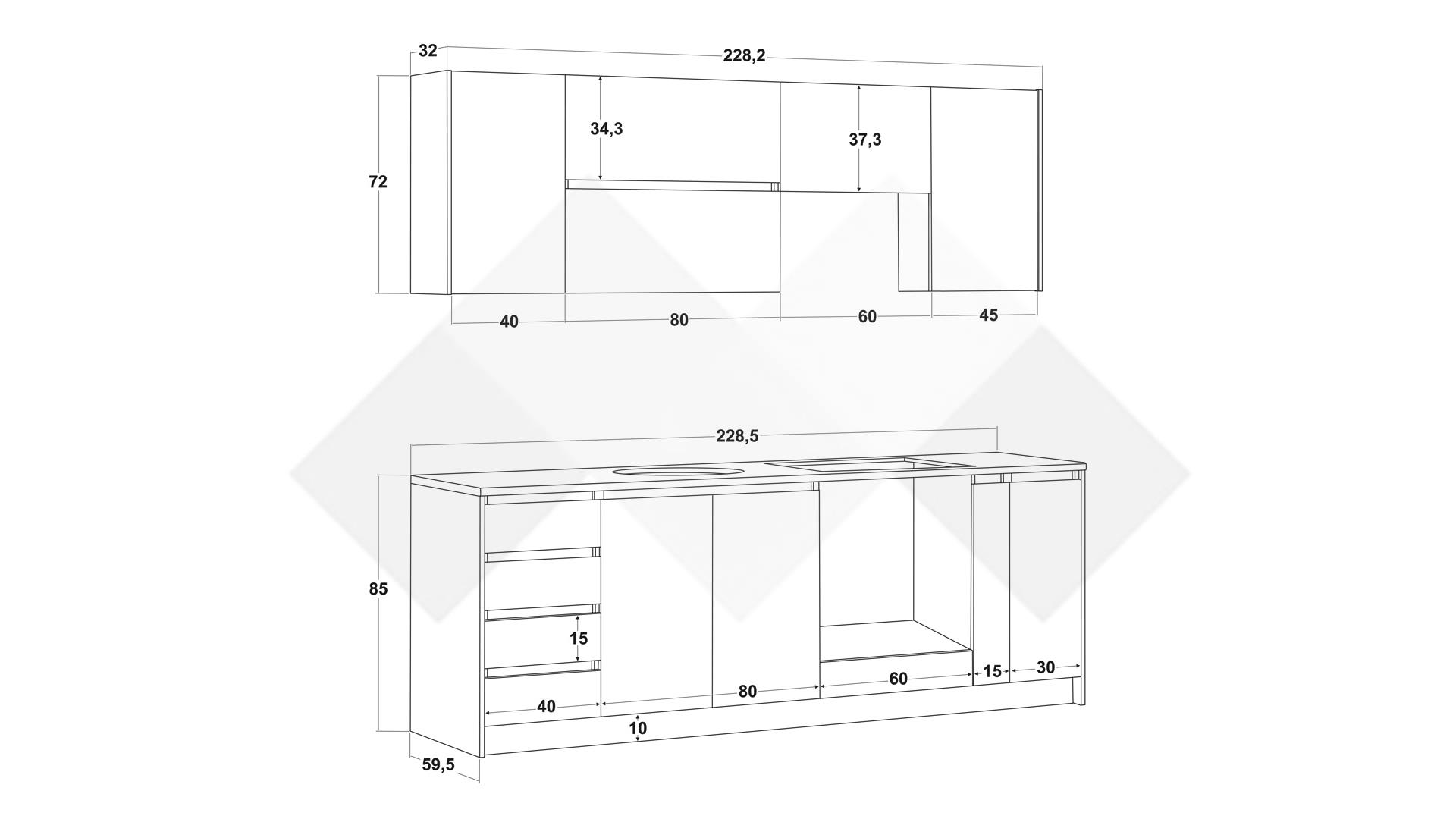 Горен модул: Д: 228,2 см. Ш: 32 см. В: 72 см.