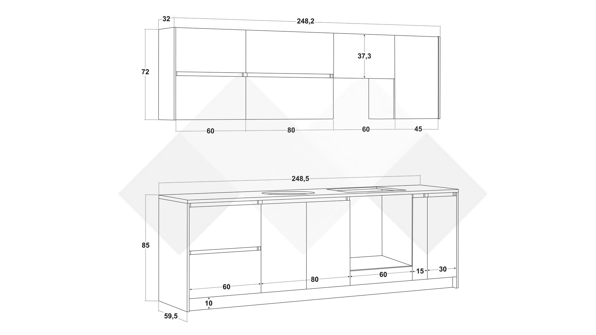 Горен модул: Д: 248,2 см. Ш: 32 см. В: 72 см.