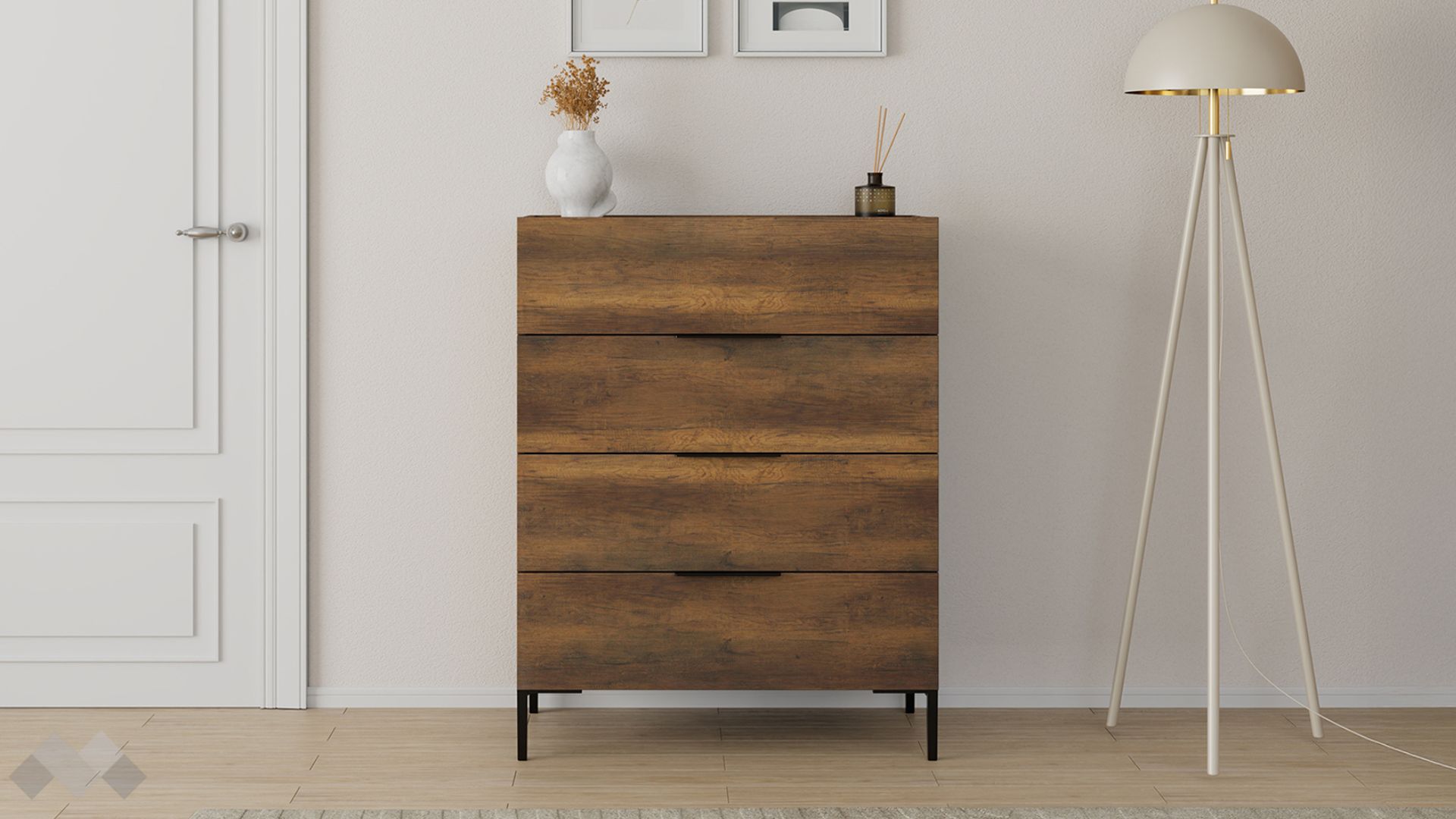 Скринът разполага с четири просторни чекмеджета, които предлагат обширно място за съхранение на бельо, аксесоари или други лични вещи. Чекмеджетата се движат плавно и безшумно, осигурявайки лесен достъп до съдържанието им. Върху него можеш да поставиш красива декорация, любима фотография на цялото семейство или сувенир, за да създадеш още по-уютна и хармонична обстановка у дома. Високите крачета позволяват лесно и удобо почистване.