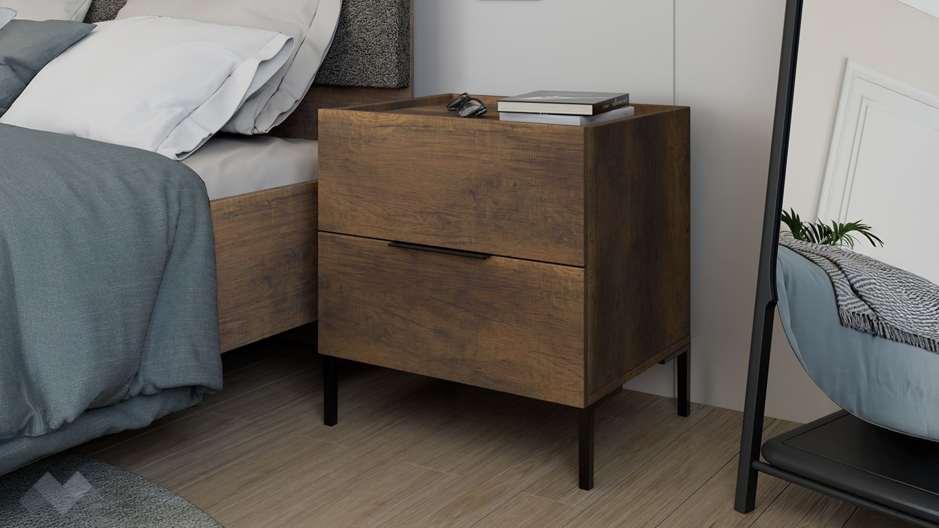 Благодарение на двете чекмеджета разполагаш с достатъчно място за организация на всякакви вещи и дребни аксесоари, които искаш да са ти под ръка. Върху плотът можеш да поставиш нощна лампа, телефон, очила или всичко, което искаш да е в близост до леглото.