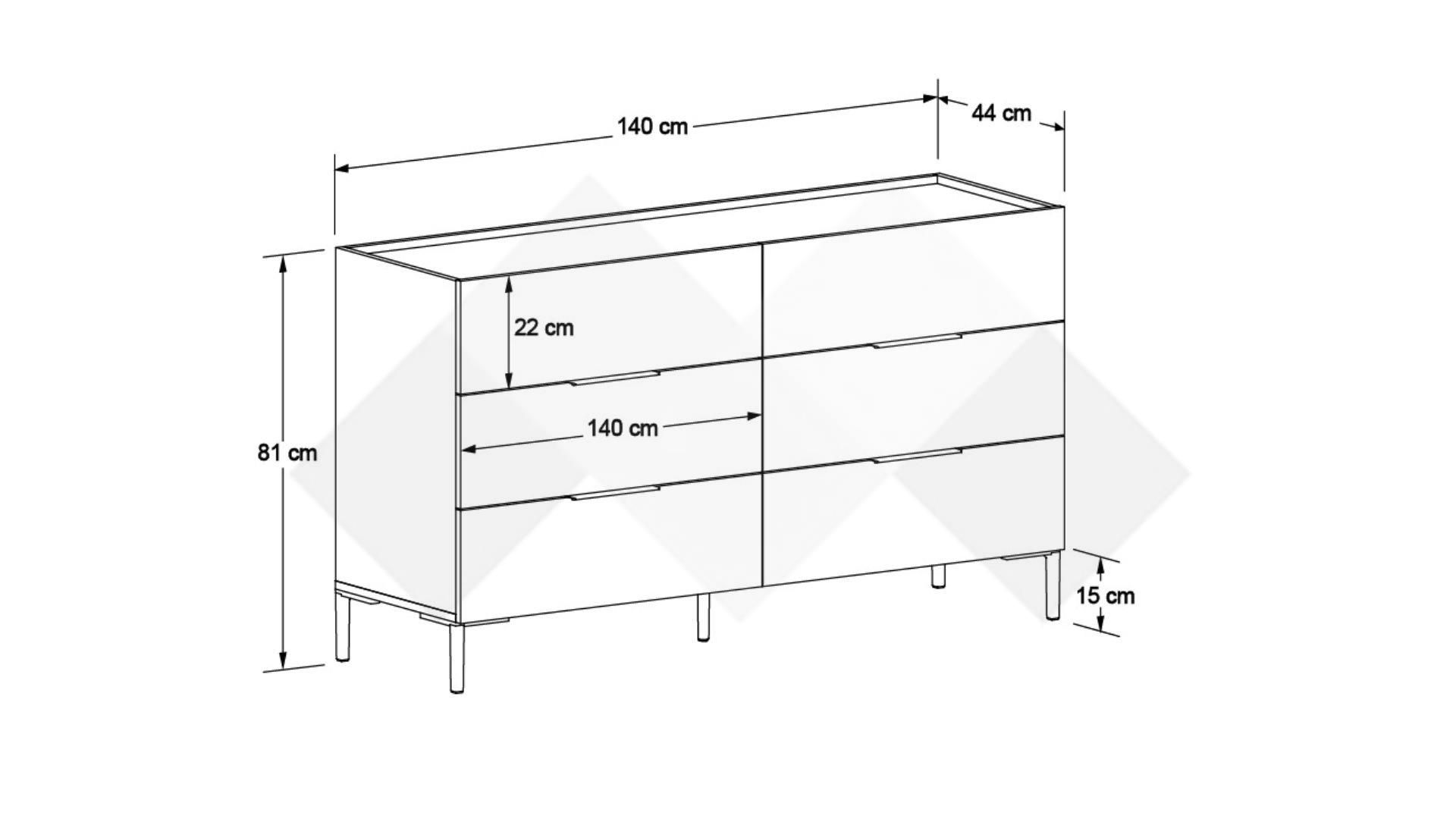 Скринът разполага с шест просторни чекмеджета, които предлагат обширно място за съхранение на бельо, аксесоари или други лични вещи. Чекмеджетата се движат плавно и безшумно, осигурявайки лесен достъп до съдържанието им. Върху него можеш да поставиш красива декорация, любима фотография на цялото семейство или сувенир, за да създадеш още по-уютна и хармонична обстановка у дома. Високите крачета позволяват лесно и удобо почистване.