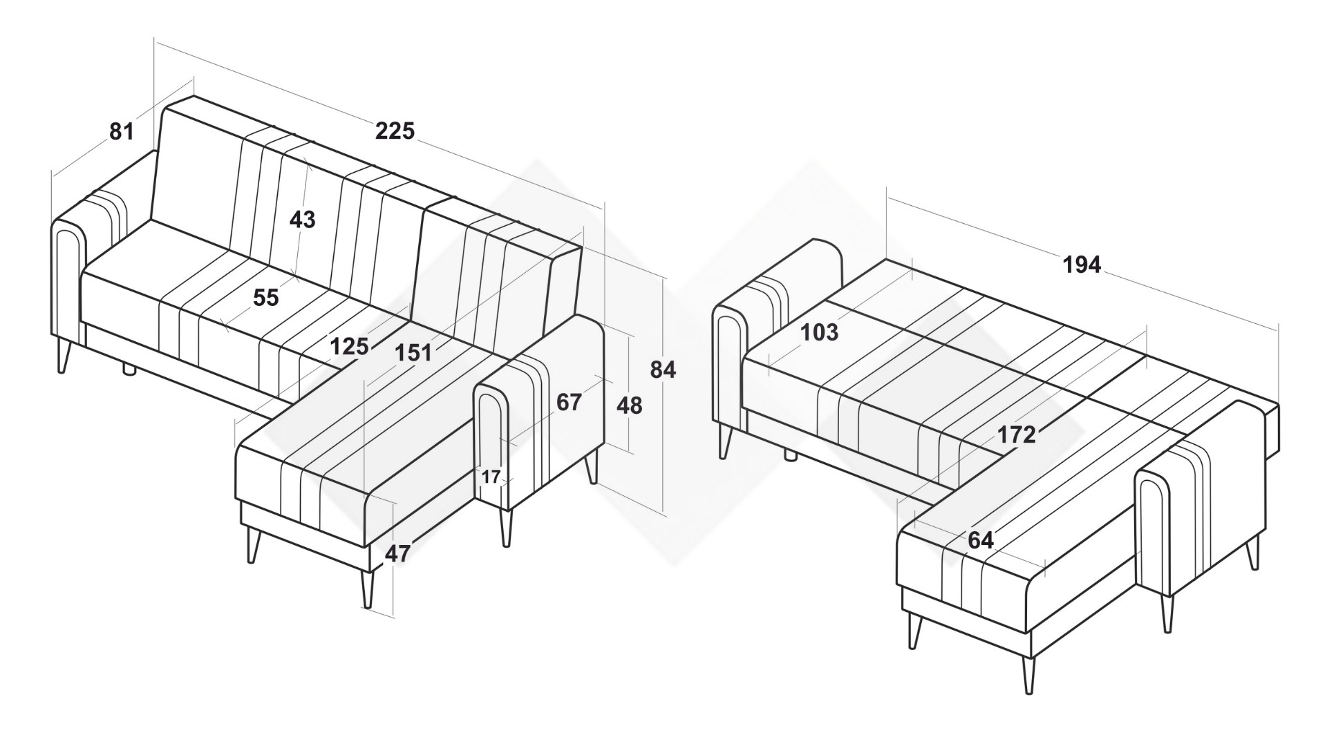 Д: 225 см Ш: 151 см В: 84 см