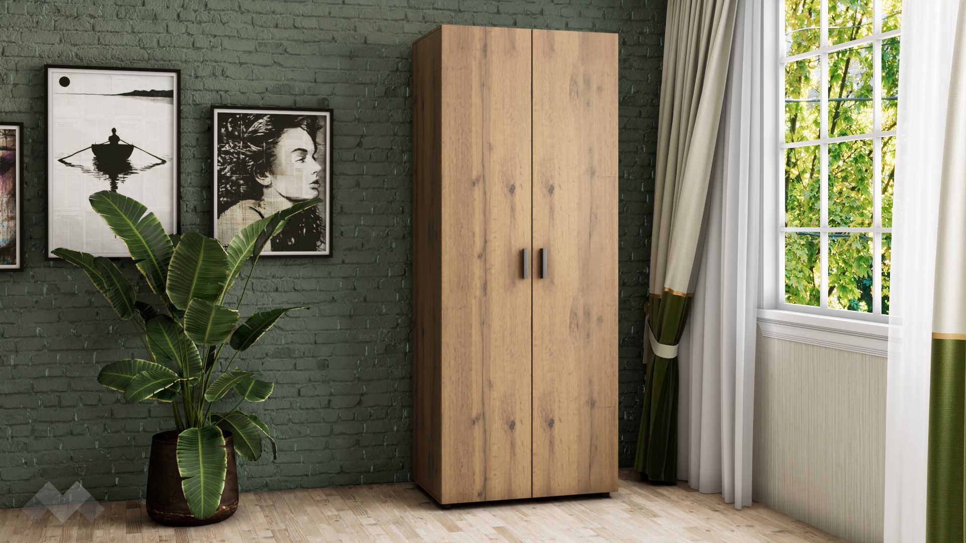 Гардероб Оптима ще ви впечатли с неутралния си декор, създаващ усещане за естествени дървесни нишки във винтидж стил. Съчетава се добре както с цветове в сивата, така и с цветове в кафявата гама. Има практично разпределение, което ви позволява да подредите добре всички дрехи и аксесоари. Той е двукрилен, с 4 обемни рафта и лост за закачалки. Можете да използвате рафтовете за съхранение на сгънати дрехи, по-обемни пуловери, завивки или други вещи, а на лоста да закачите всичко, което искате да бъде готово за обличане.