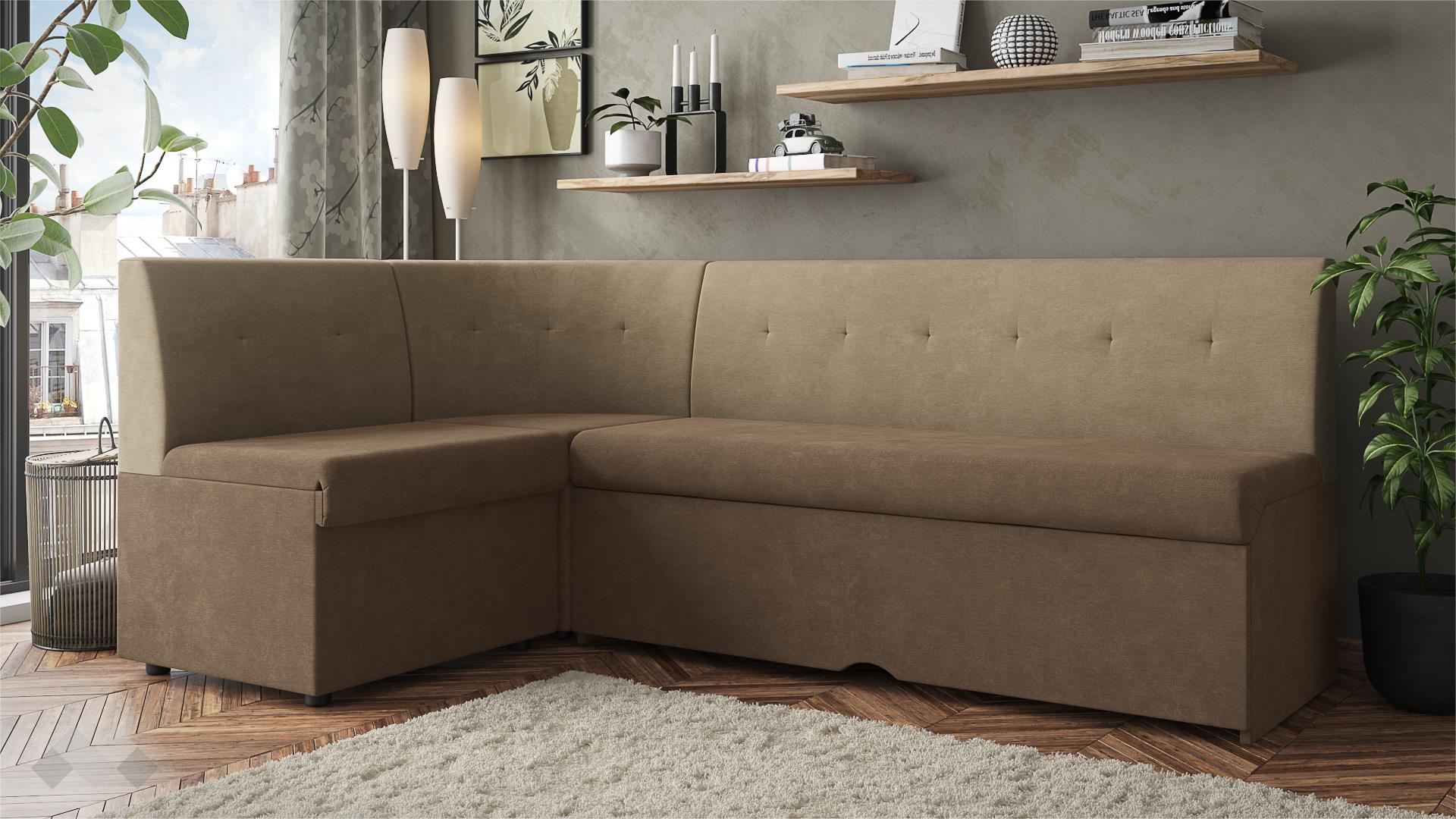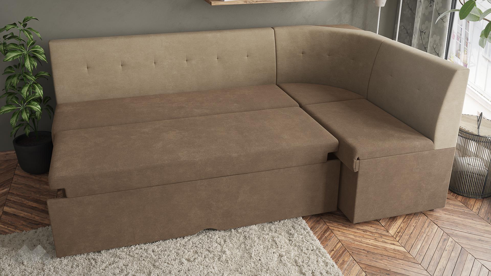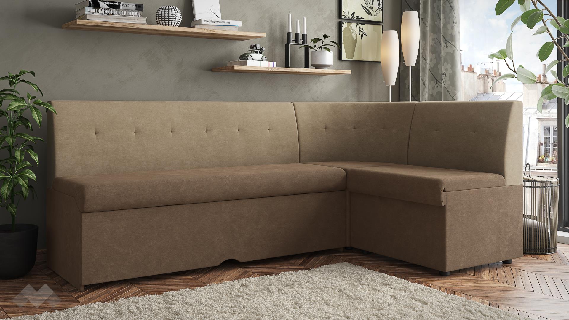 Кухненски ъгъл Патрик е класически кухненски диван, по-твърдата седяща част дава отлична упора при хранене, което прави дивана идеално допълнение на трапезната маса. Ако ти дойдат гости с преспиване, можеш бързо да разтегнеш дивана и вече разполагаш с легло с размери 100/180 см. Подматракът за спане е тапициран в същия цвят като седалната и облегалната част. Мекотата на цялата спалня площ е еднаква, благодарение на качествената изработка. Платът, с който е тапициран, е здрав и износоустойчив.