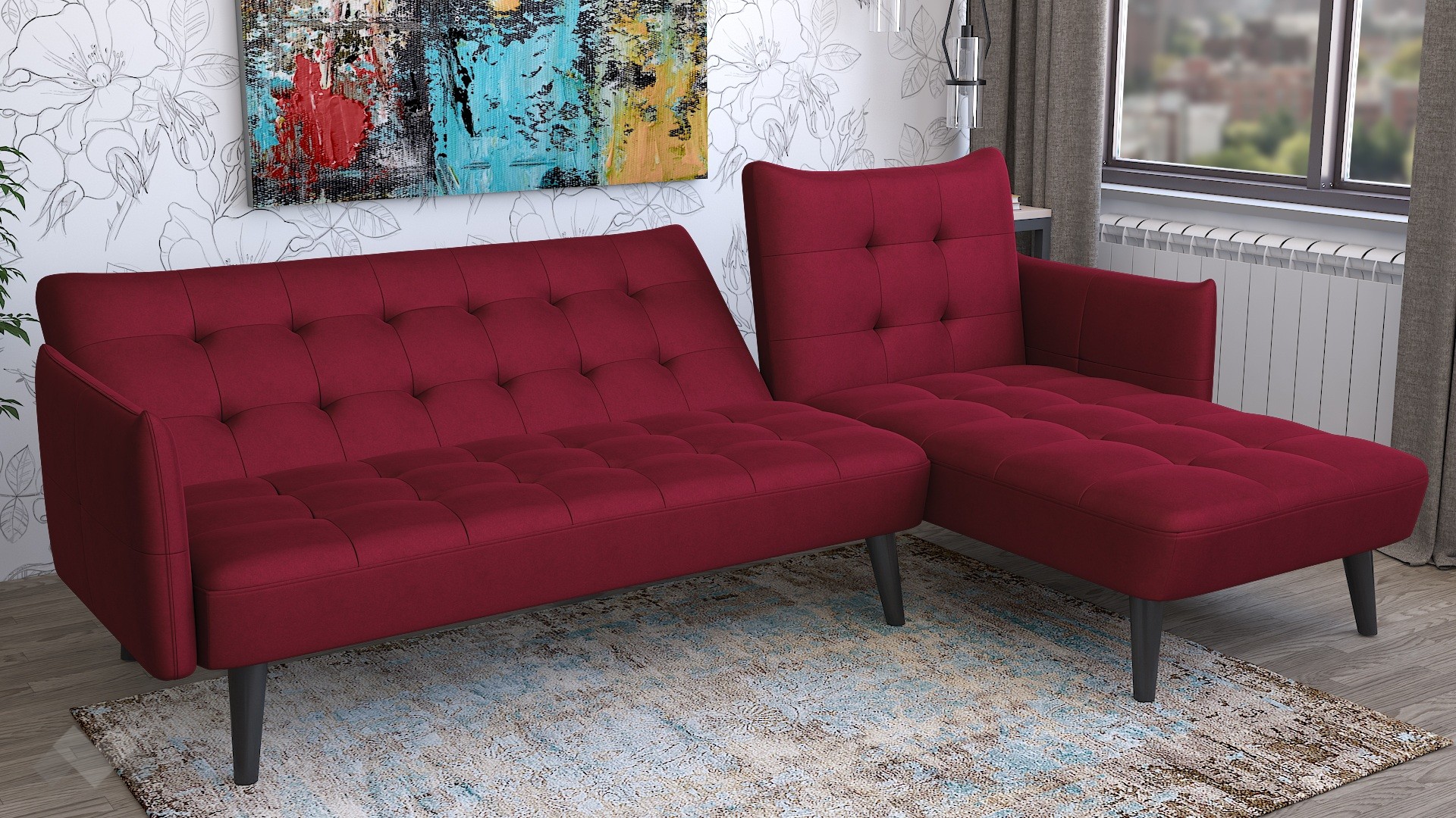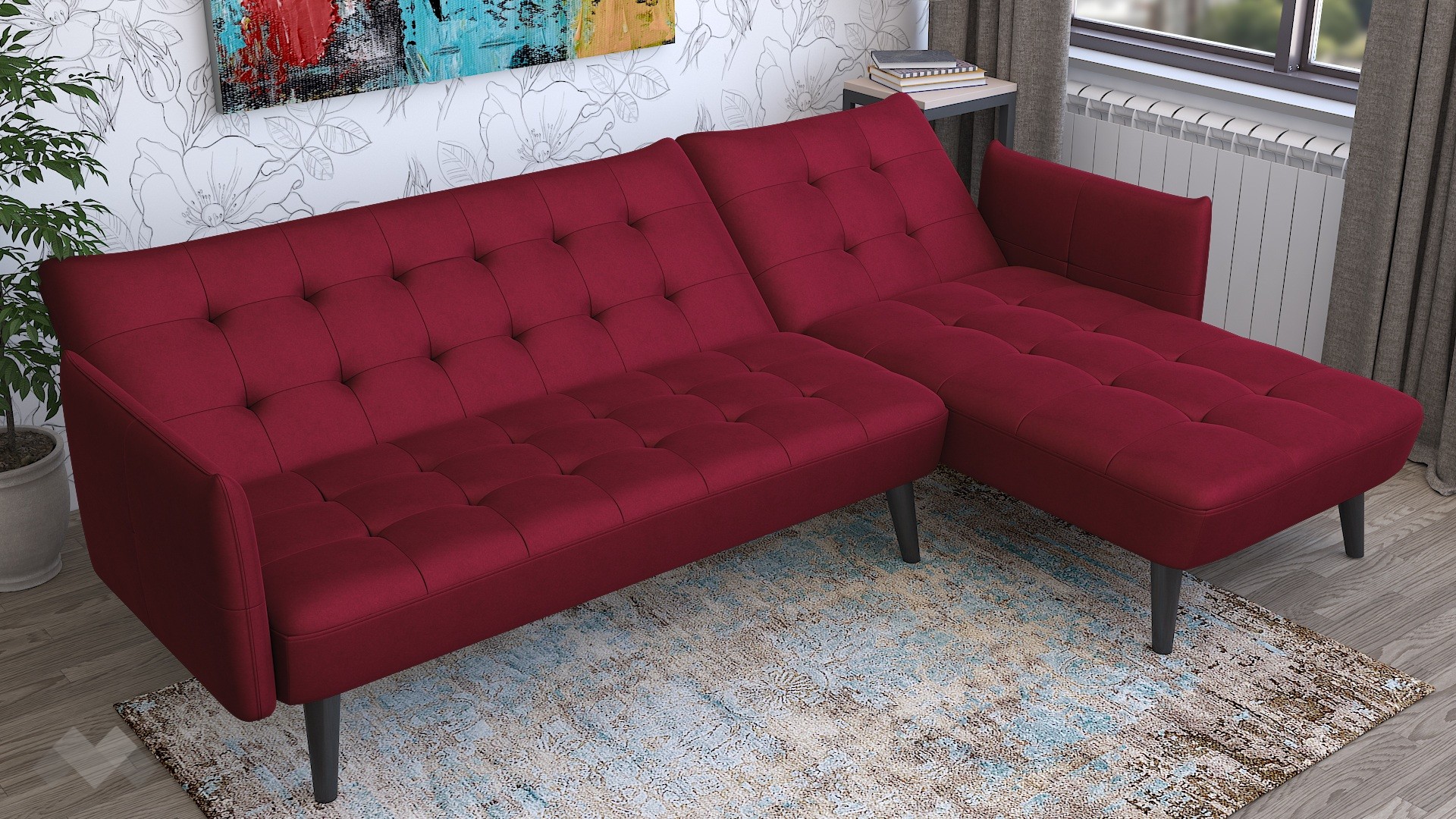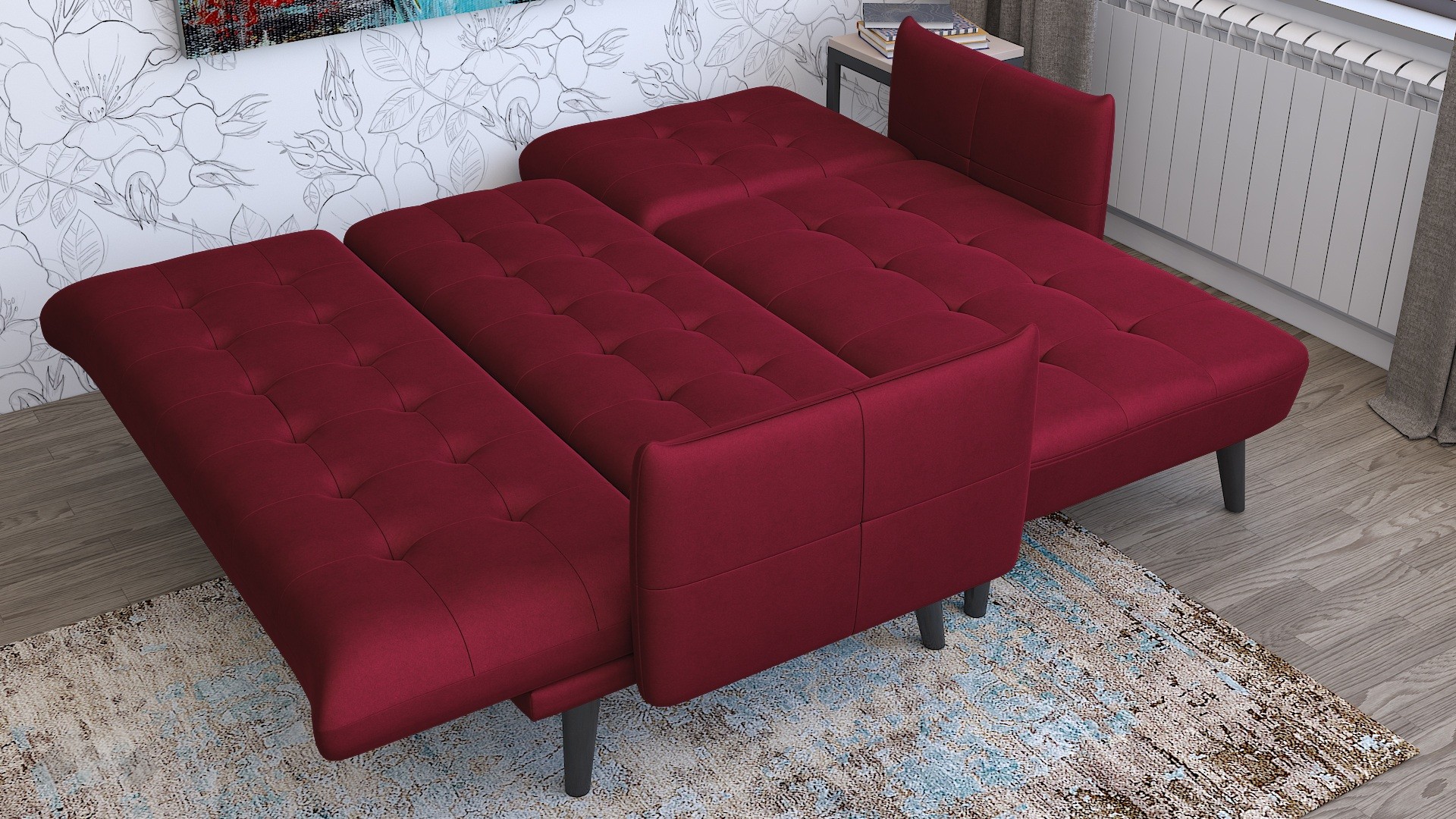 Капитонираната облегалка и седалка придават характер и уют, а тапицерията в елегантен бордо цвят добавя модерен акцент в интериора. Високите крака от черен масив осигуряват стабилност и улесняват почистването под дивана.