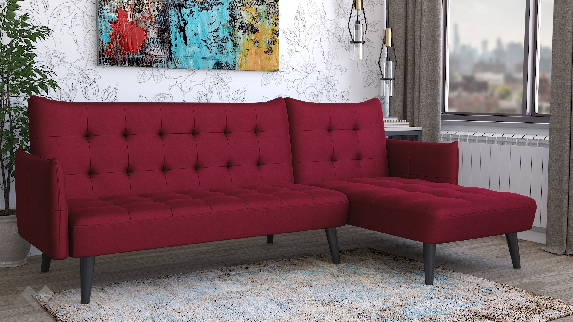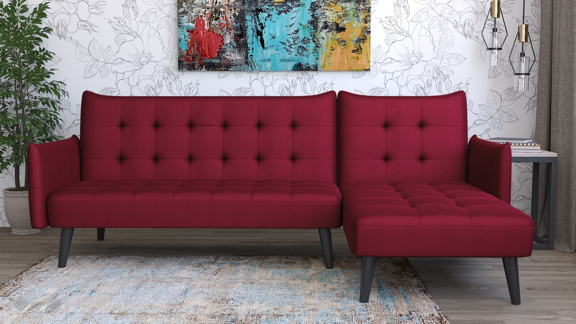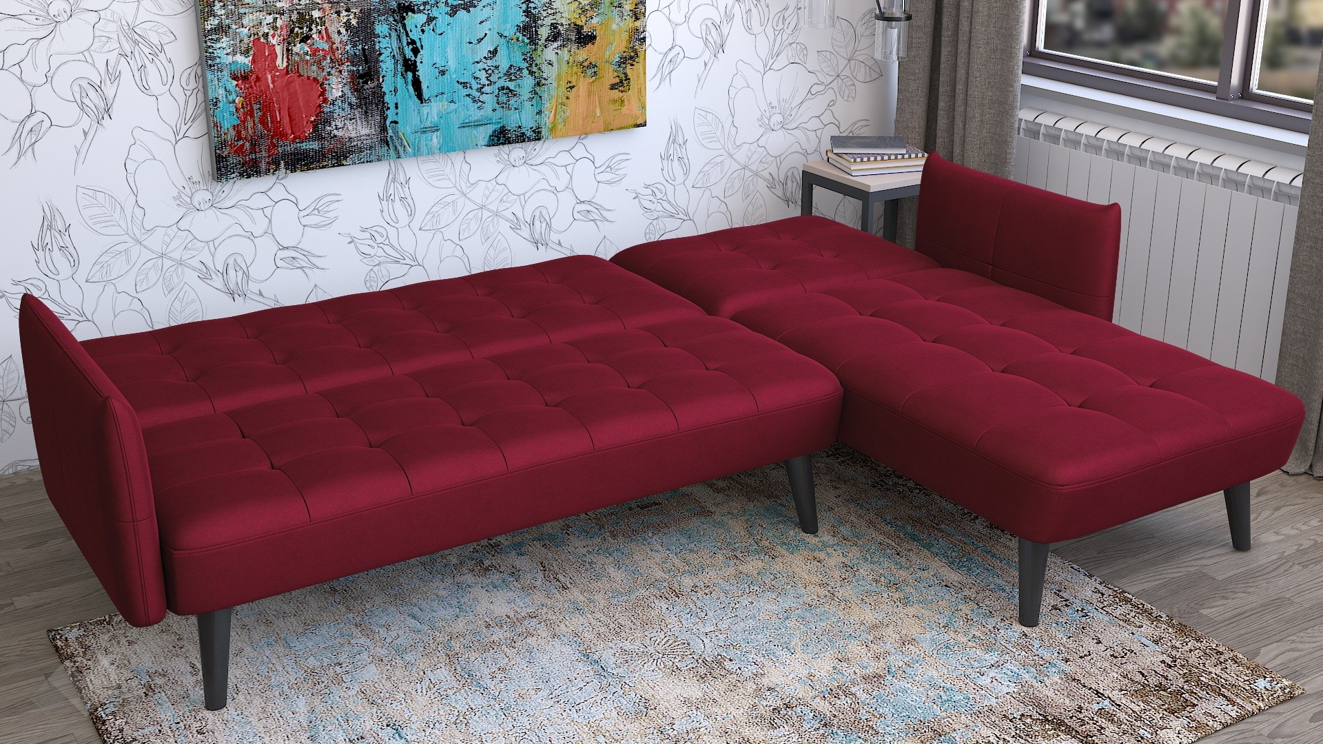 Капитонираната облегалка и седалка придават характер и уют, а тапицерията в елегантен бордо цвят добавя модерен акцент в интериора. Високите крака от черен масив осигуряват стабилност и улесняват почистването под дивана.