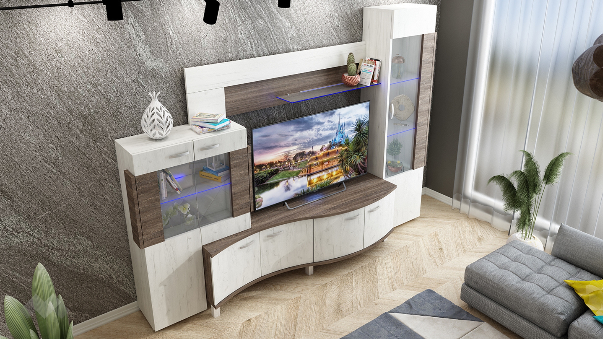 Секция Плей неизменно ще промени твоя дом към едно по-красиво, уютно и модерно място. Тя разполага с висока витрина и витринен шкаф, където да подредиш красиви сервизи, скъпи предмети, стилни украси и декорации, които няма да убягнат от погледите на гостите ти, но и ще бъдат съхранени на сигурно място. В ТВ шкафа ще откриеш голямо пространство, в което да организираш всичките си дискове и съпътстваща техника като ТВ приемници, DVD плейъри или друга техника. Шкафчетата са с извити врати, които създават усещане за лекота и са приятни за окото. Горната част на секцията предлага полица, на която да подредиш скъпи спомени като любими фотографии или сувенири от почивки, а защо не и цвете, което ще освежи помещението и ще му придаде по-жизнен и цветен вид. Към рафтовете на витрината, витринния шкаф и полицата е монтирано ефектно LED осветление, което дискретно ще освети пространството около секцията и ще придаде допълнителен ефект към предметите поставени там.