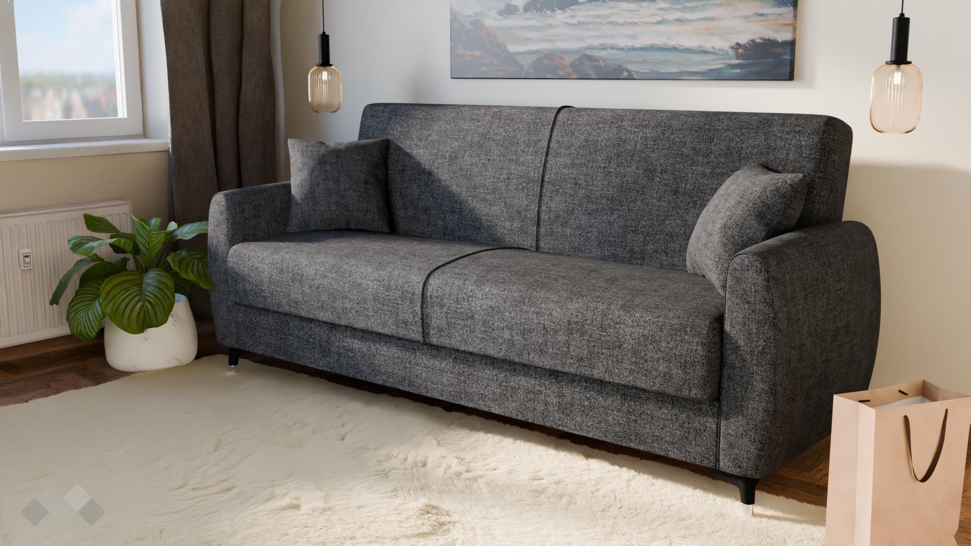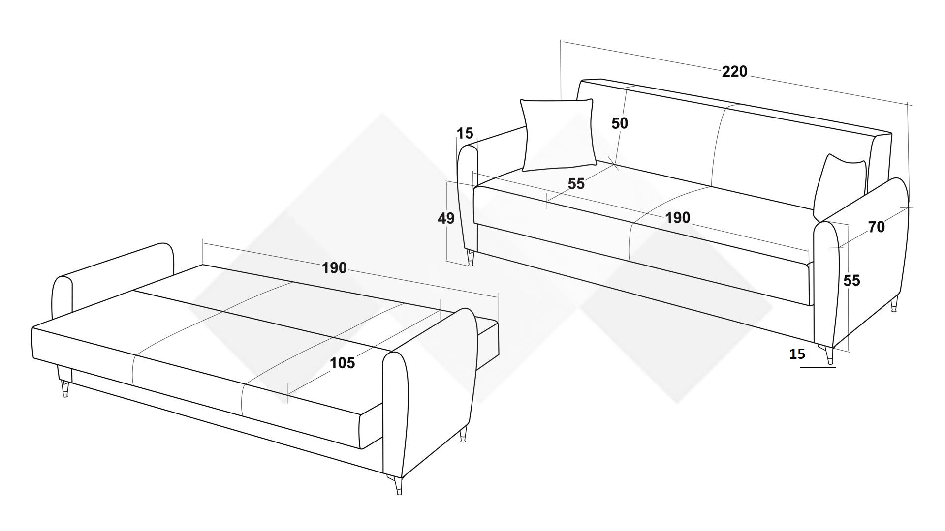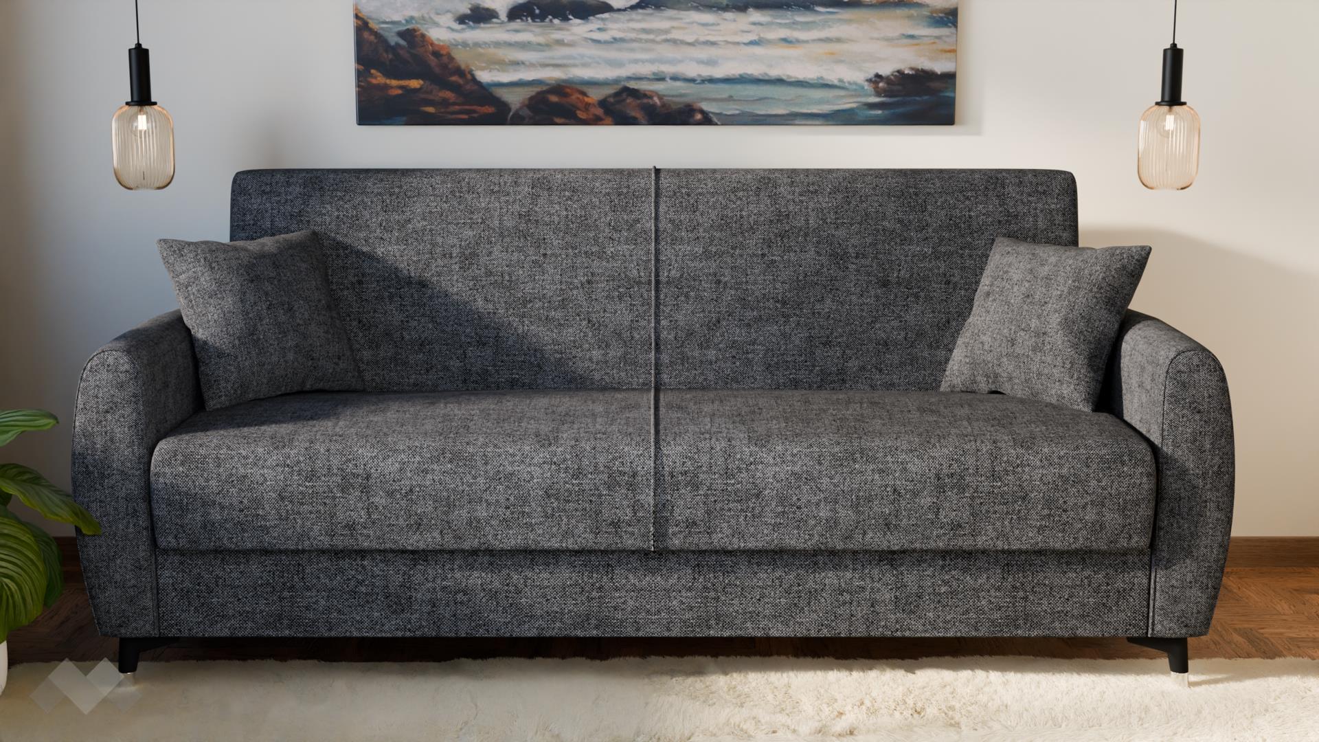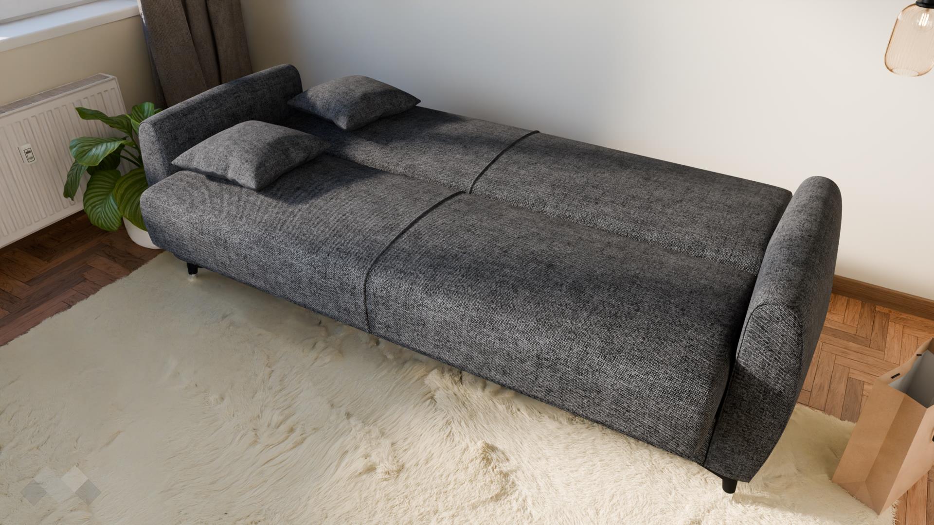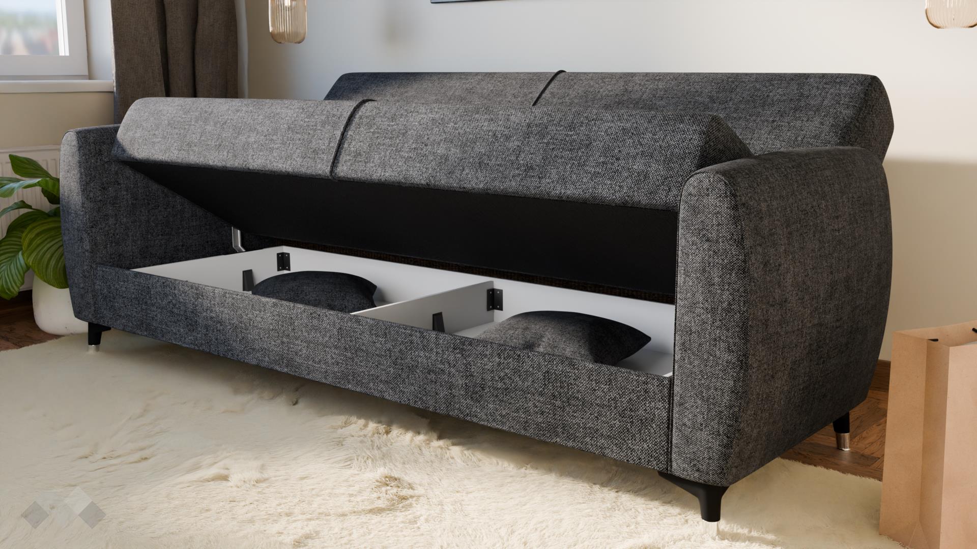 Диванът разполага с функция сън с размер 105/190 см, която бързо и лесно го превръща в удобно легло с клик-клак-механизмът - идеално както за ежедневна употреба, така и за гости. Благодарение на практичната ракла за съхранение, можеш удобно да подредиш одеяла, възглавници и спално бельо, без да заемаш допълнително място в стаята.