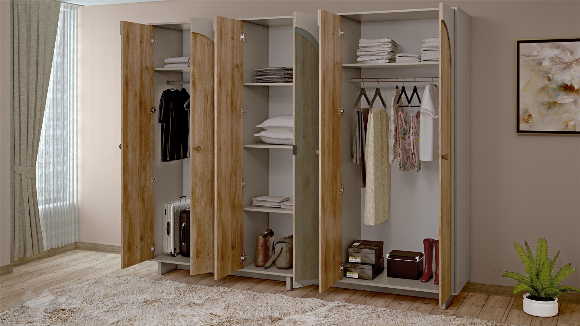 Гардеробът е с шест врати, зад които се крият общо пет рафта и два лоста за закачалки. Достатъчно пространство, за да прибереш както сгънати дрехи, така и такива, които не желаеш да се намачкват, за да са готови за обличане. Средните две врати са с огледала, за да огледаш визията си финално.