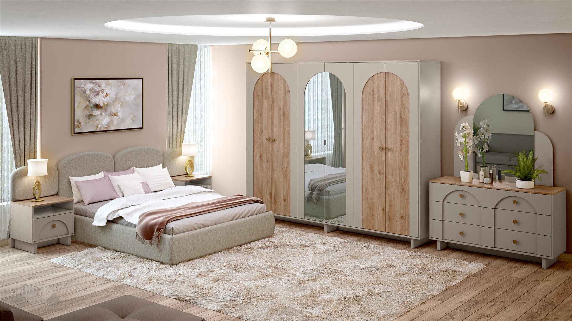 ⭐Предимства: ✓ 18 мм ПДЧ ✓ тапицирана спалня ✓ мека тапицирана табла ✓ 2 нощни шкафа ✓ скрин с 4 чекмеджета и огледало ✓ шесткрилен гардероб ✓ врати с огледала ✓ 2 лоста за закачалки ✓ 5 рафта ✓ модерен бохемски декор ✓ модерен бохемски декор ✓ качествена изработка