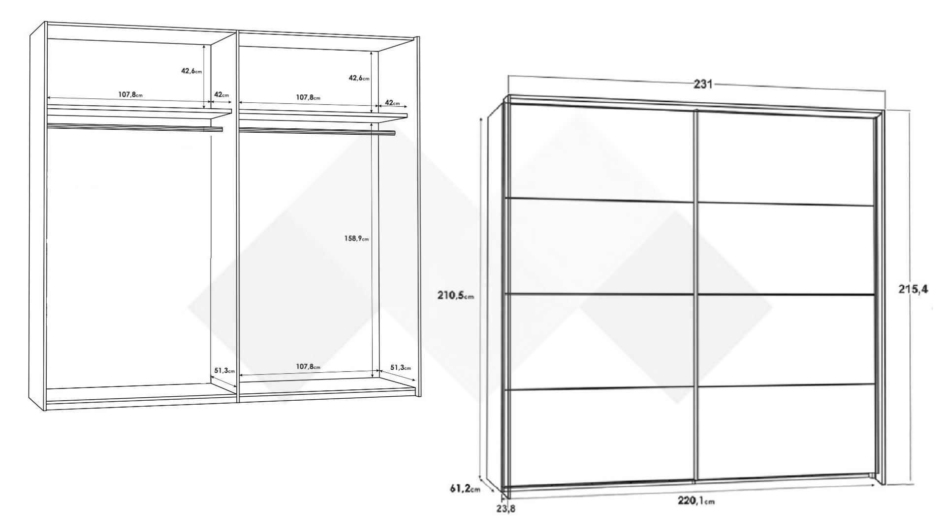 Разполага с две плъзгащи врати, които осигуряват лесен достъп до вътрешността, без да заемат допълнително място при отваряне. Вътрешната част е организирана с лост за закачалки и отделения за сгънати дрехи.