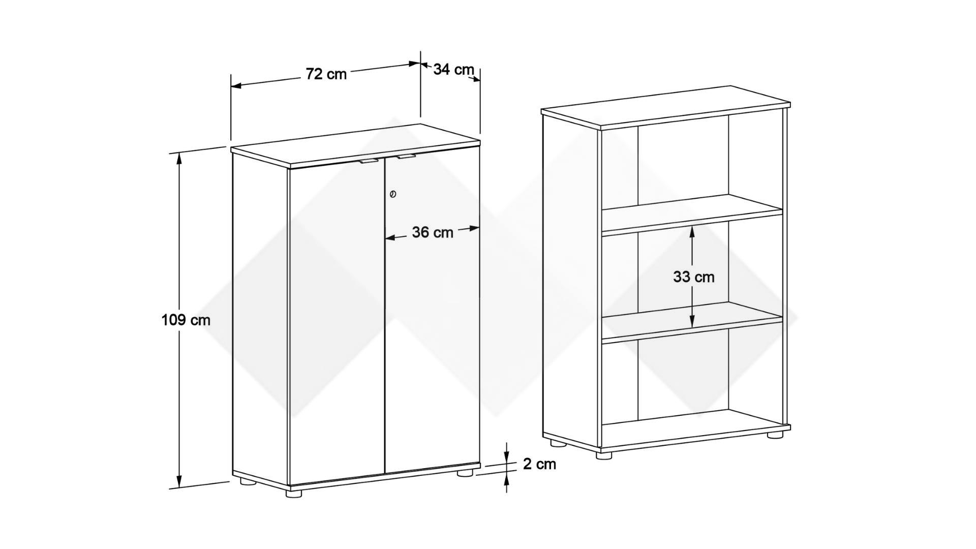 Зад двете врати на скрина са разположени два удобни рафта, които ти позволяват да разделиш пространството и да организираш документи, папки, офис консумативи или лични вещи по твой вкус. Всеки предмет, който съхраняваш, остава защитен благодарение на здравата ключалка.