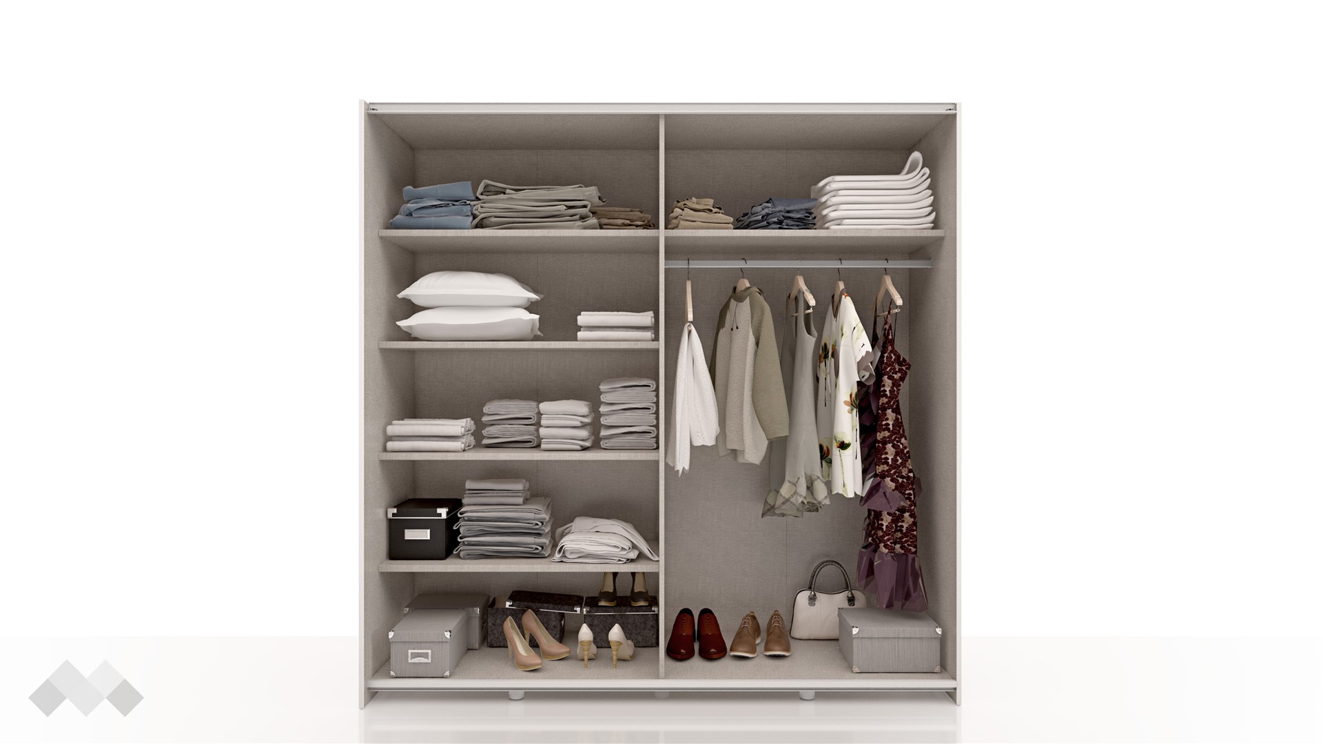 Гардеробът е оборудван с пет просторни рафта, които са подходящи за сгънати дрехи, аксесоари или кутии за съхранение. Лостът за закачалки предоставя достатъчно място за съхранение на облекла, като запазва дрехите ти изправени и лесно достъпни.