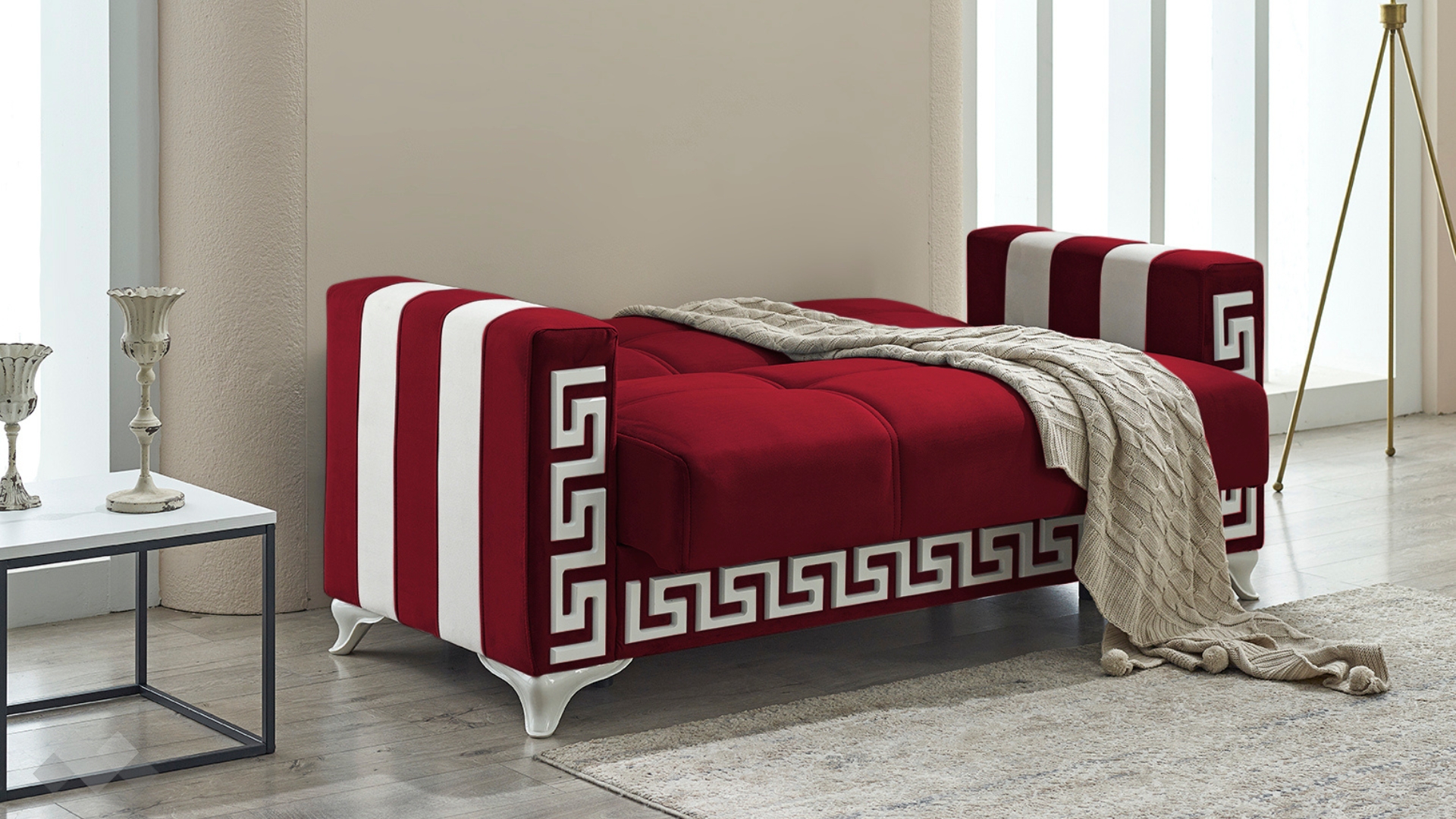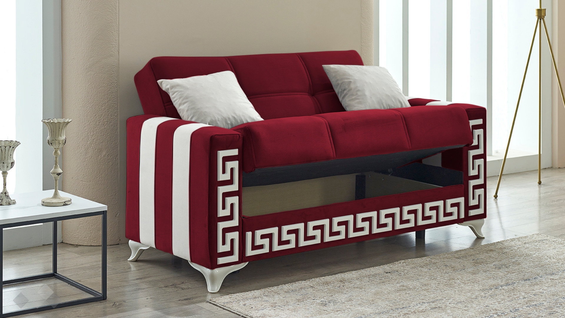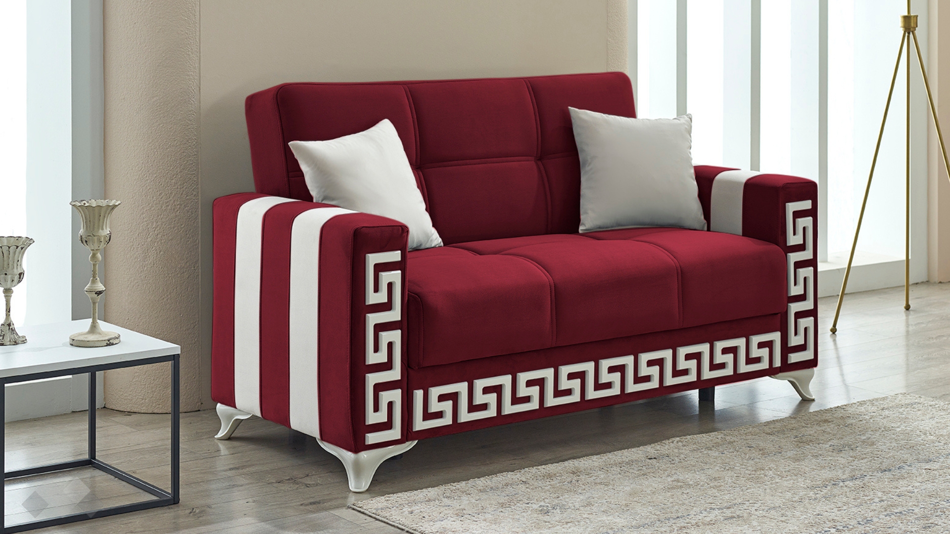 Диван Сабина впечатлява с елегантност и стилна визия. Подлакътниците имат вертикални бели ивици отстрани, които допълват белия декоративен кант на лицевата част на дивана и белите му крака. Комбинацията с фигуралните шевове по дамаската и умело подбрания ѝ цвят го превръщат в истинско интериорно бижу.