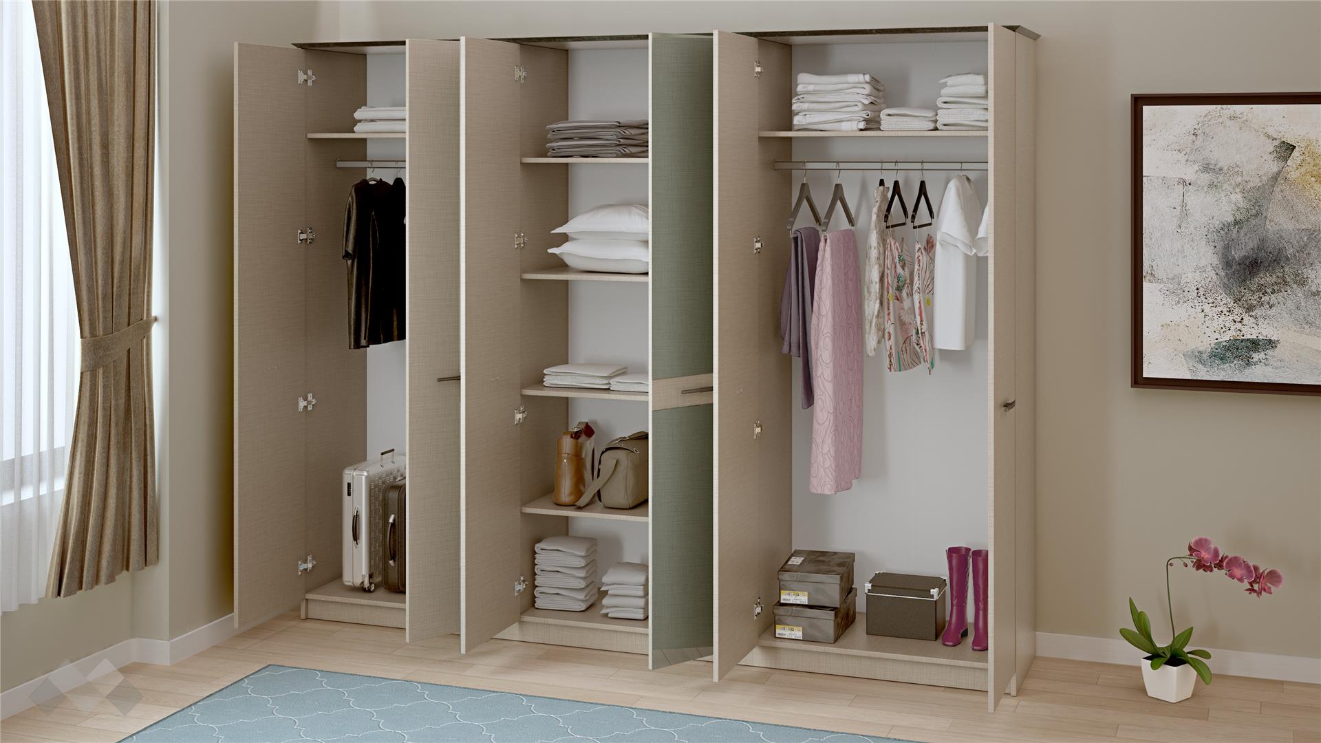 Гардеробът е просторен и функционален - с два лоста за закачалки и шест рафта, за да организираш всичките си дрехи. Двете огледални врати, освен, че служат за финален оглед на визията си, те визуално увеличават пространството и отразяват светлината в помещението. Елегантните дръжки подчертават модерния и изискан стил.