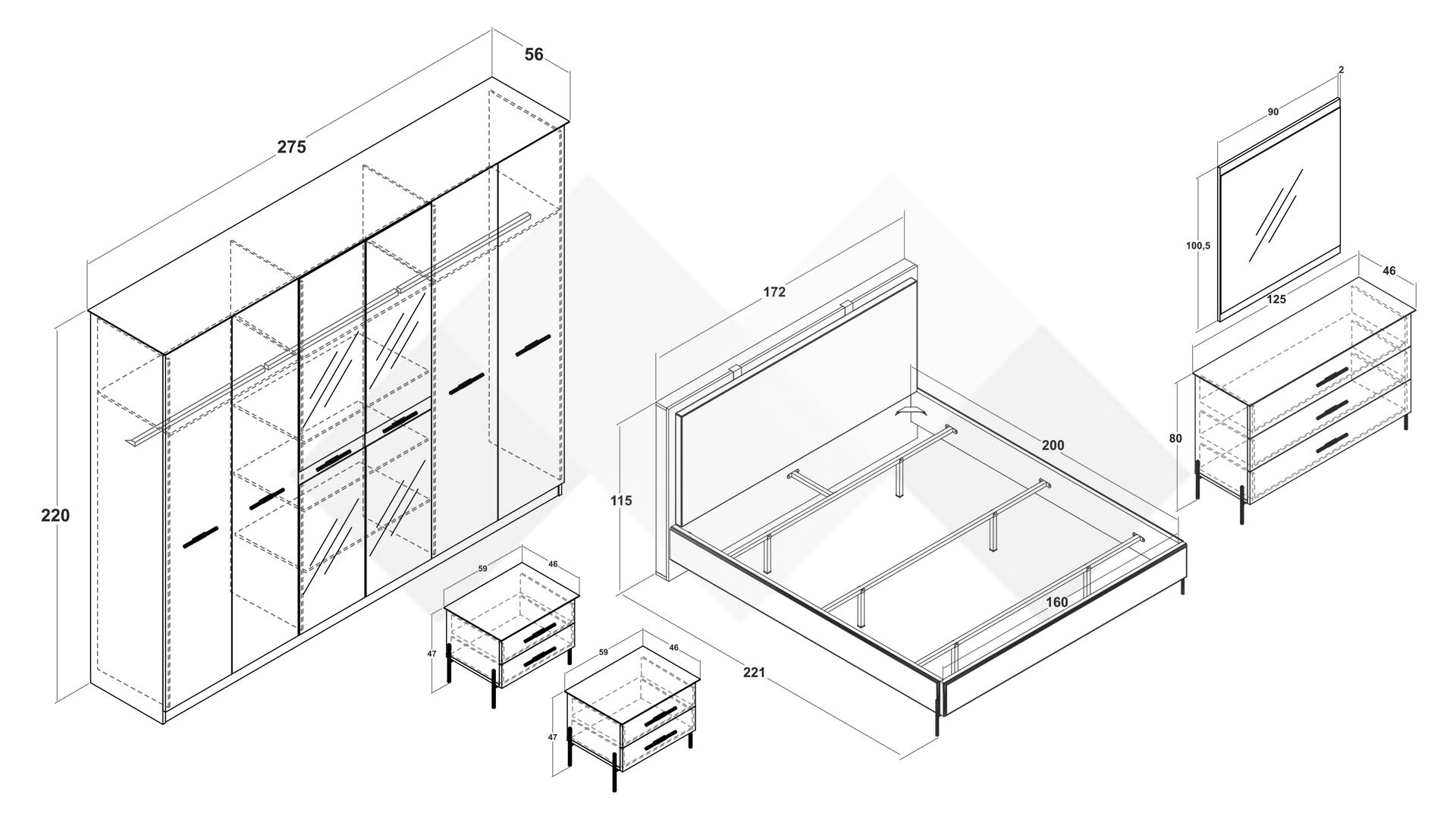 ✓ 18 мм ПДЧ ✓ тапицирана спалня ✓ еко кожа ✓ мека дамаска ✓ 2 бр. нощен шкаф ✓ 2 чекмеджета ✓ скрин ✓ 3 чекмеджета ✓ огледало ✓ плавно затваряне ✓ за матрак 160/200 ✓ шесткрилен гардероб ✓ 2 лоста за закачалки ✓ плавно затваряне на вратите ✓ 6 рафта ✓ модерен декор ✓ качествена изработка