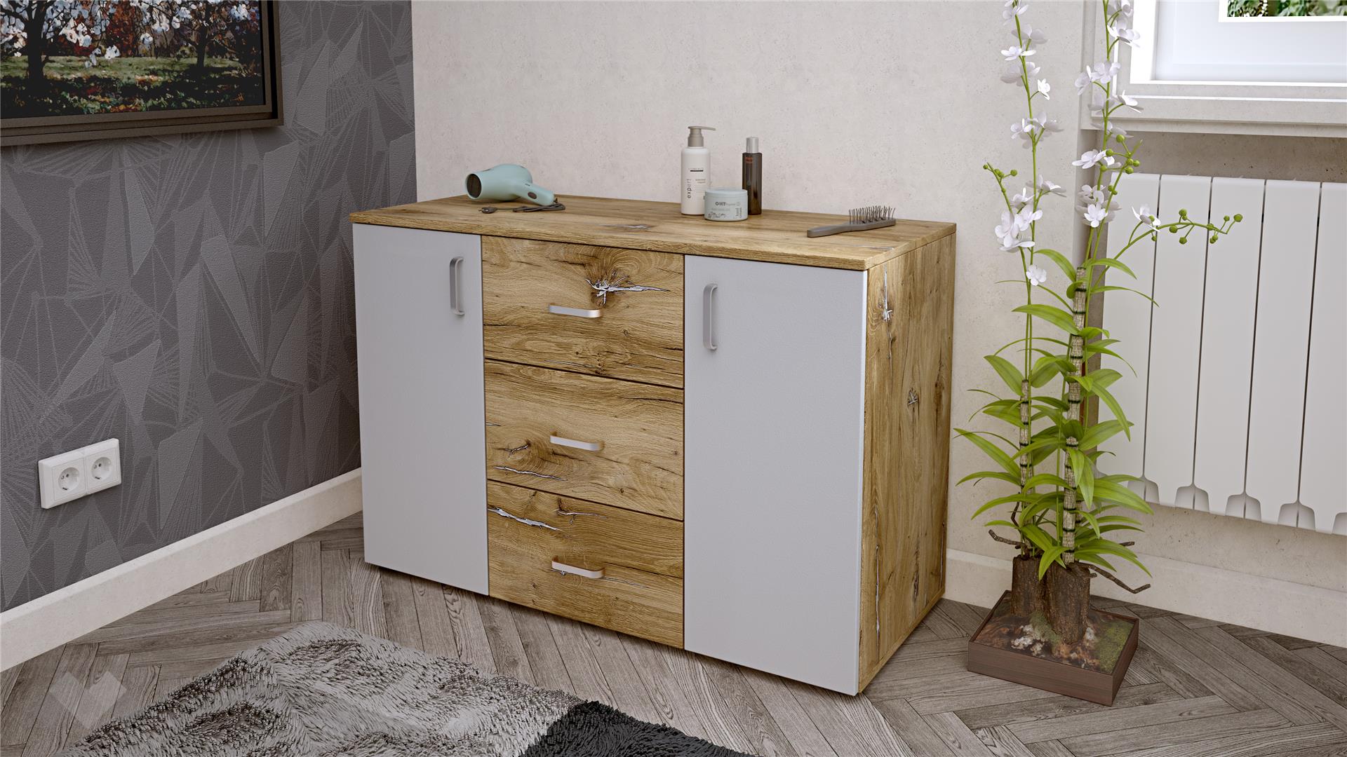 ✓ 16 мм ПДЧ ✓ 3 чекмеджета ✓ 2 врати ✓ 2 рафта ✓модерен дизайн ✓ практично разпределение ✓ качествена изработка