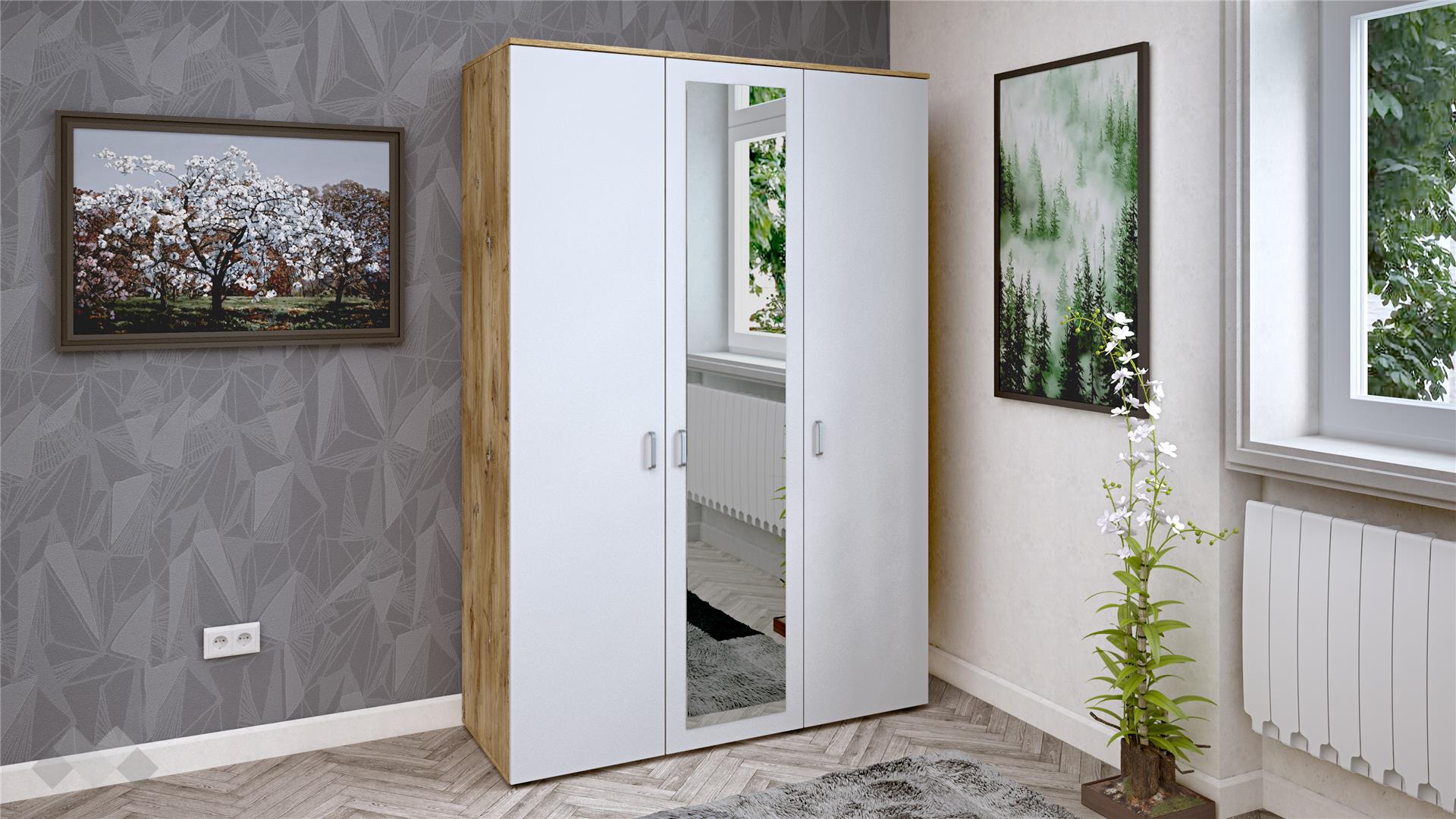 Трикрилениятб гардероб разполага с лост за закачалки, който е подходящо място, на което да подредиш палта и по-обемни връхни дрехи или да закачиш всичко, което искаш да бъде готово за обличане, а чтрите рафта са удобни за подреждане на сгънати дрехи, обувки и кутии за съхранение. Огледалото ще помогне с поглед над цялата ти визия.