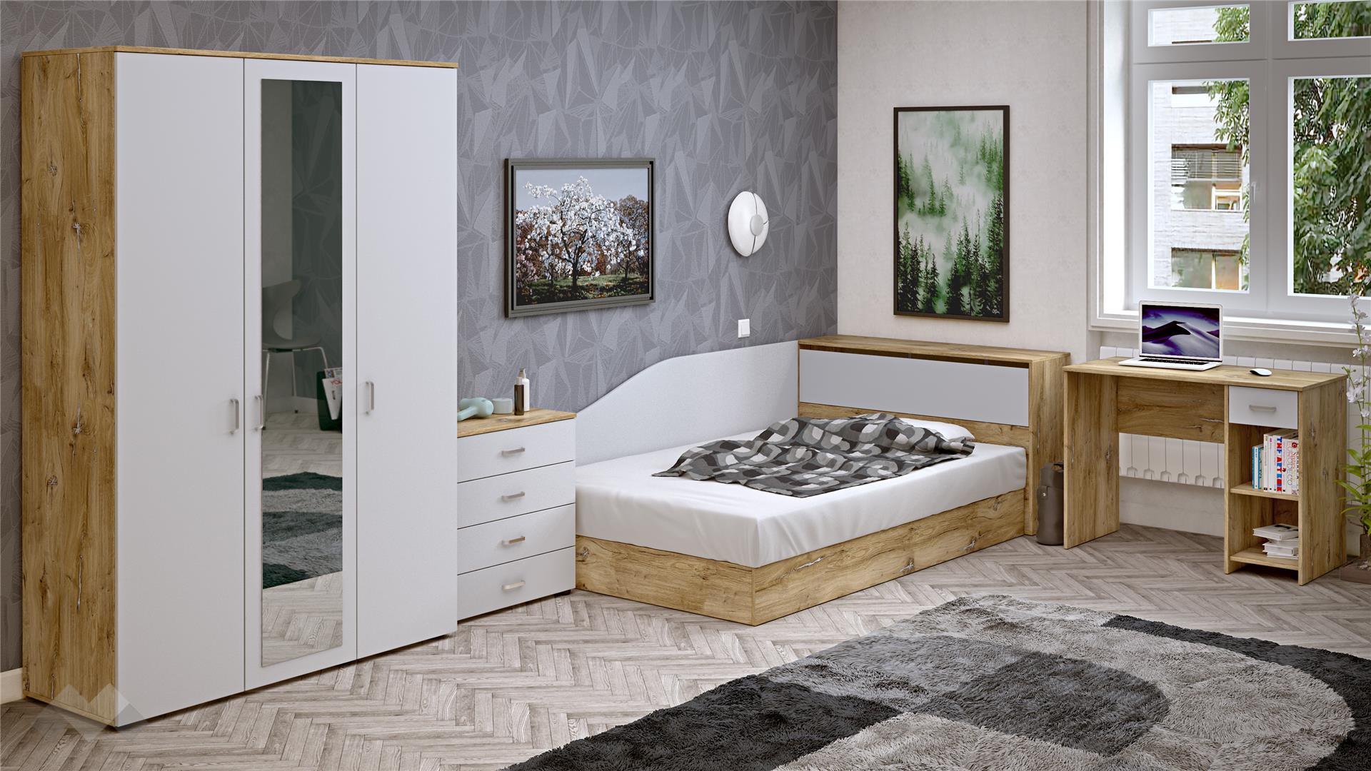 ⭐ Предимства: ✓ 16 мм ПДЧ ✓ приста за матрак 120/190 ✓ механизъм за повдигане на матрака ✓ ракла ✓ трикрилен гардероб ✓ огледало ✓ лост за закачалки ✓3 рафта ✓ бюро ✓ чекмедже ✓ скрин ✓ 4 чекмеджета ✓ модерен дизайн ✓ качествена изработка