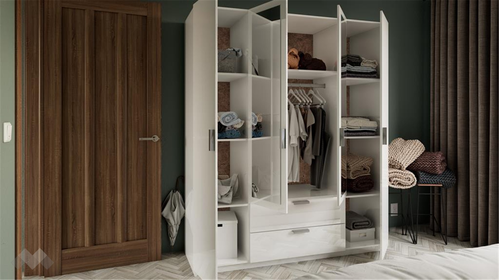 Гардероб Шайн е практичен четирикрилен гардероб с 7 обемни рафта, лост за закачалки и две чекмеджета. Има практично разпределение, което ти позволява да подредиш добре всички дрехи и аксесоари. Можеш да използваш рафтовете за съхранение на сгънати дрехи, по-обемни пуловери, завивки или други вещи, а на лоста да закачиш всичко, което искаш да бъде готово за обличане. В чекмеджетата можеш да организираш бельо или аксесоари.