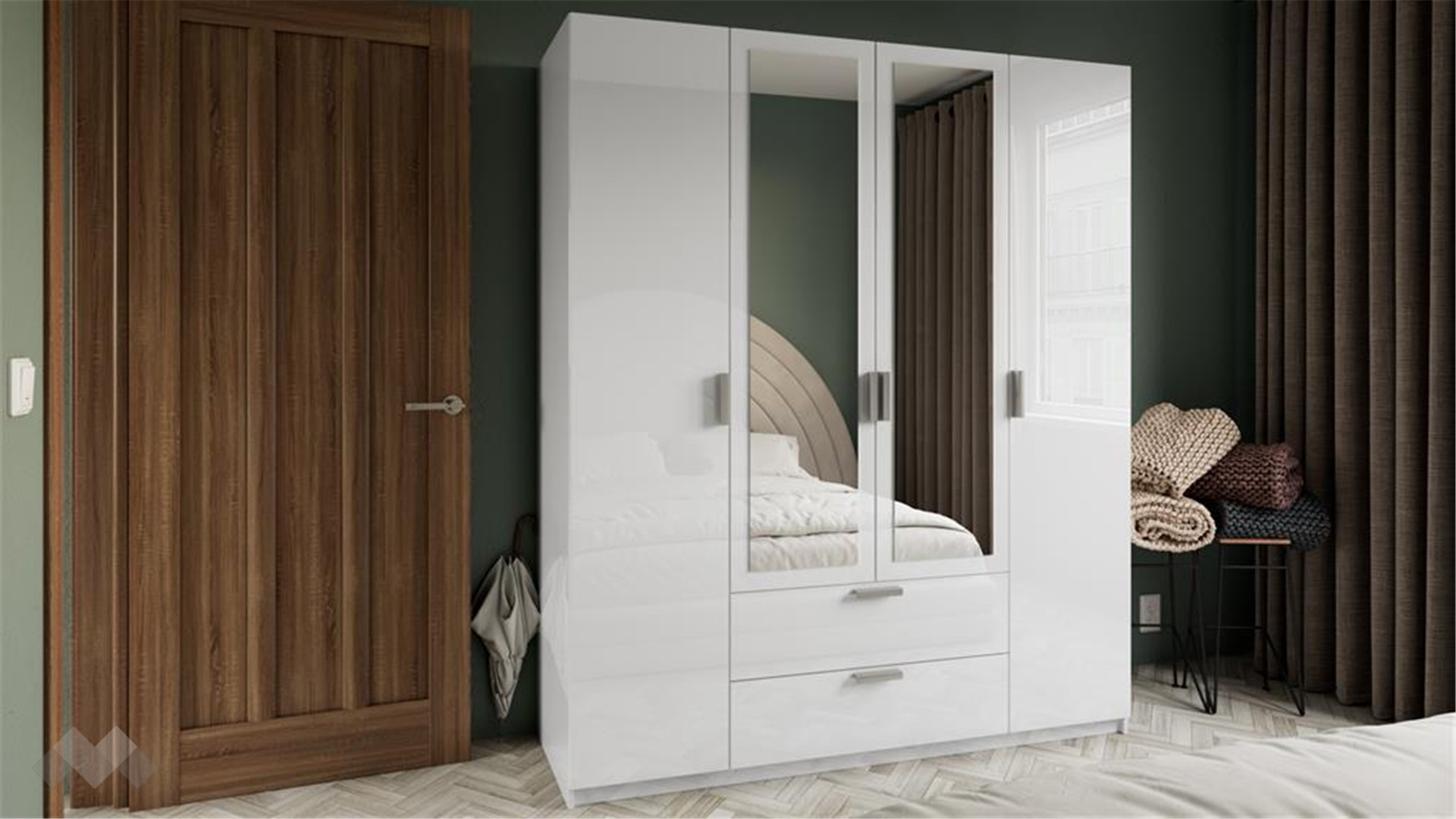 ⭐ Предимства: ✓ четирикрилен ✓ 2 чекмеджета ✓ 7 рафта ✓ лост за закачалки ✓ 2 огледала ✓ модерен декор ✓ практично разпределение ✓ качествена изработка ✓ 16 мм ПДЧ