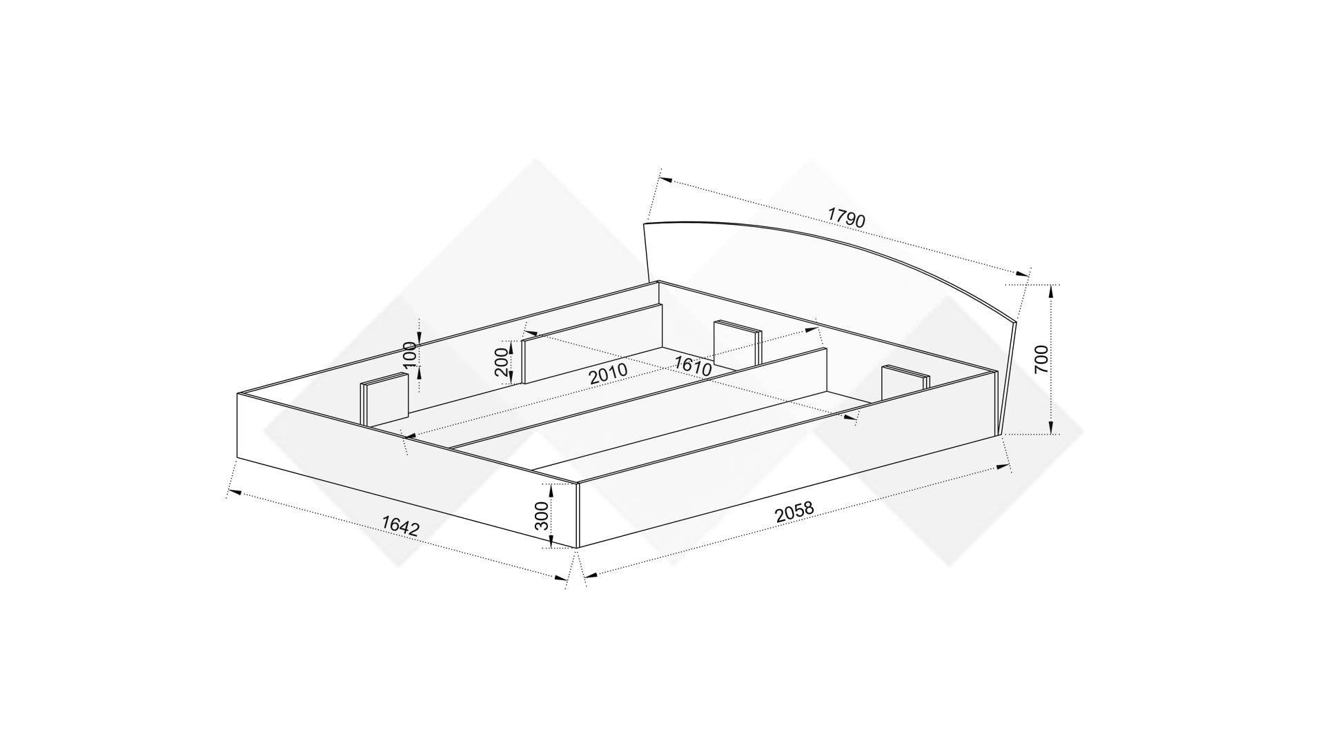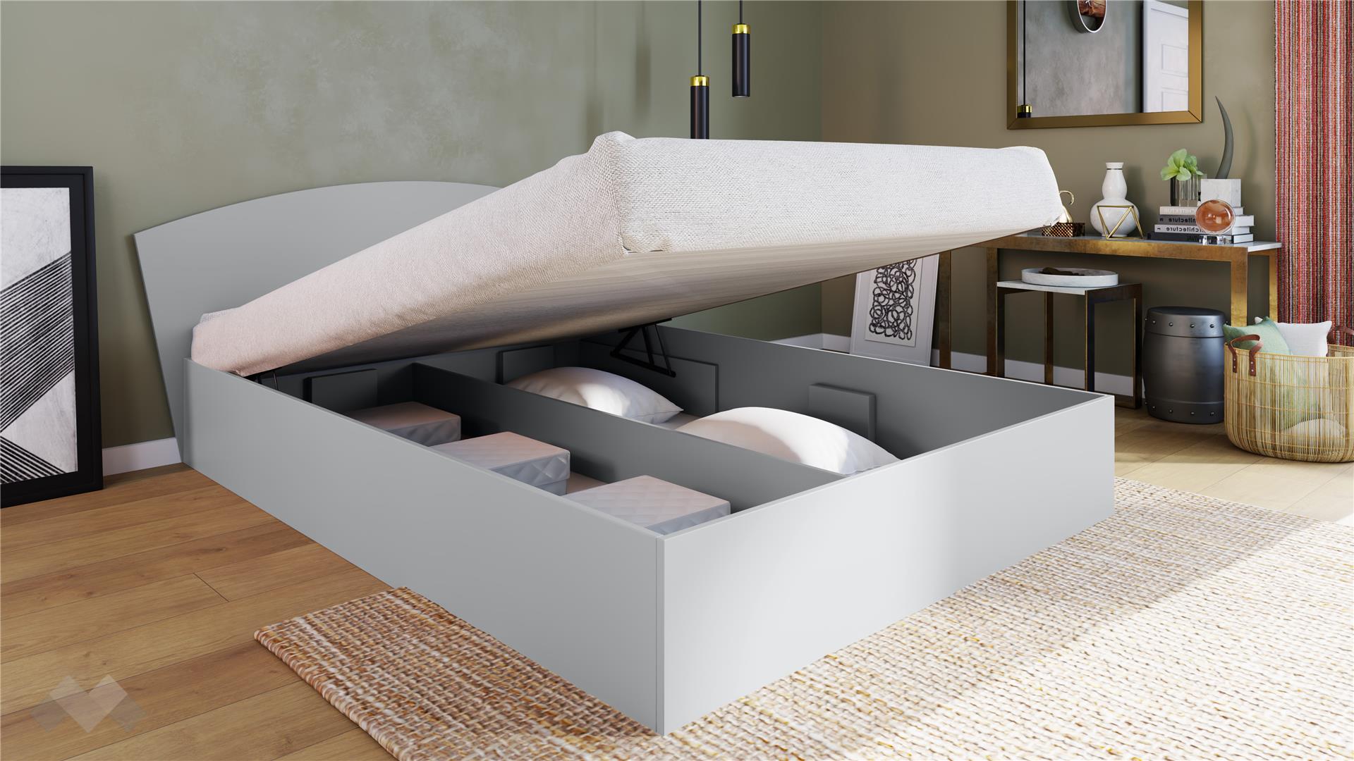 Спалнята е за матрак с размер 160/200 см. Включеният повдигащ механизъм осигурява лесен достъп до подматрачното пространство, което е идеално място за съхранение на спално бельо, одеяла, сезонни дрехи и други вещи. Заоблената табла омекотява линиите на дизайна.