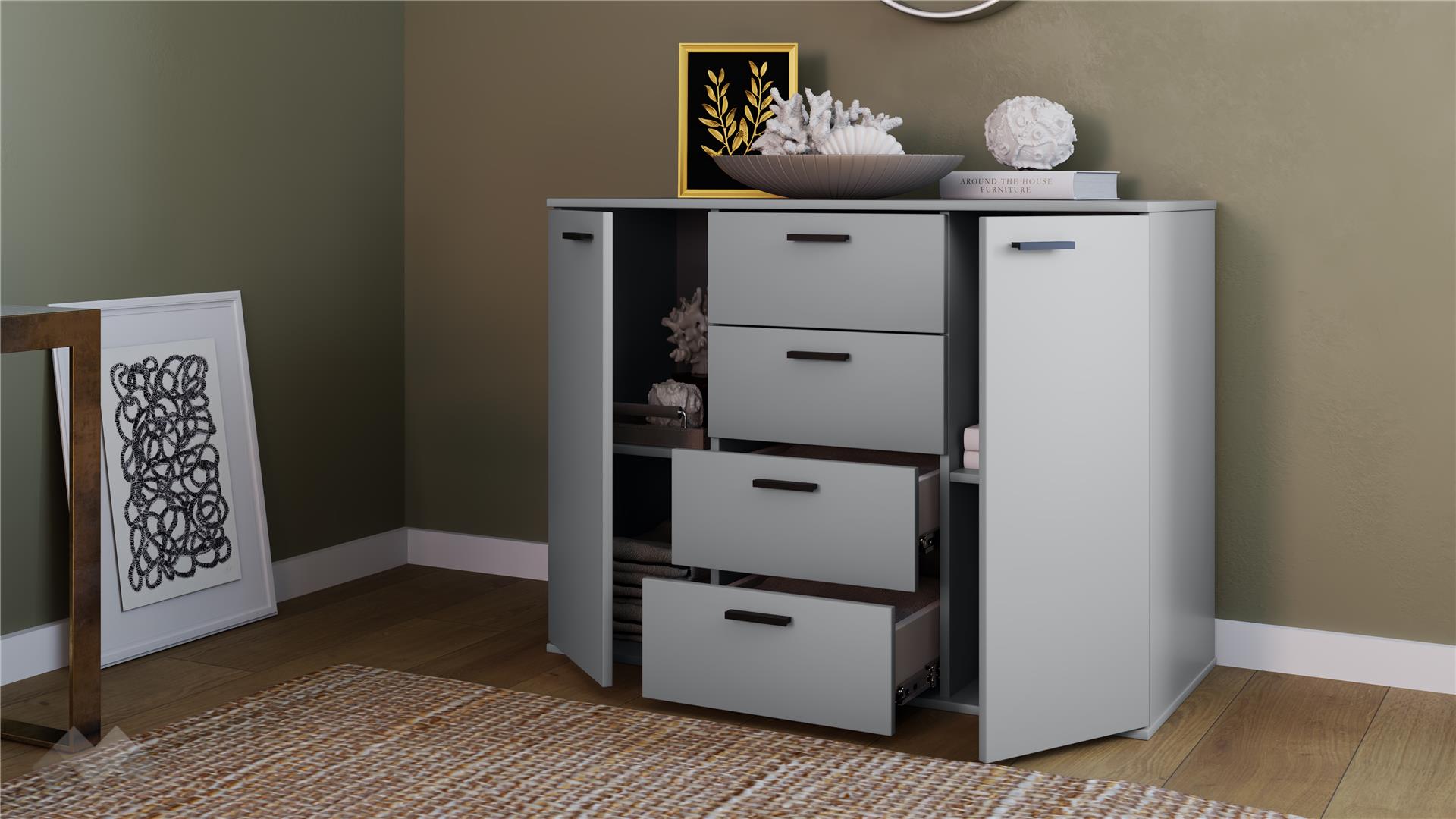 Скринът е снабден с четири чекмеджета, които са разположени вертикално и предоставят достатъчно място за съхранение на дрехи, спално бельо, аксесоари или документи. Те са снабдени със сачмени водачи с пълно изтегляне и плавно прибиране, характеризиращи се със стабилност, устойчивост и издръжливост при по-голямо натоварване.