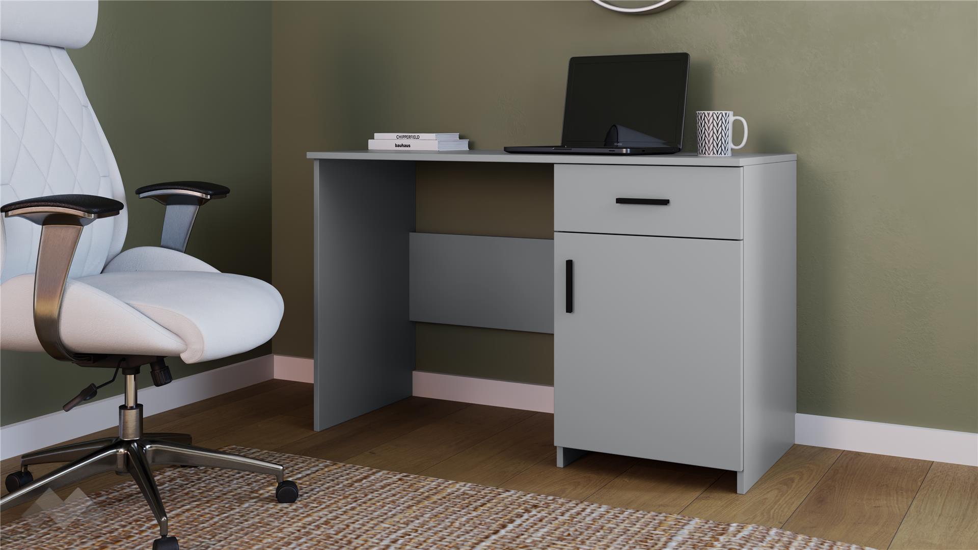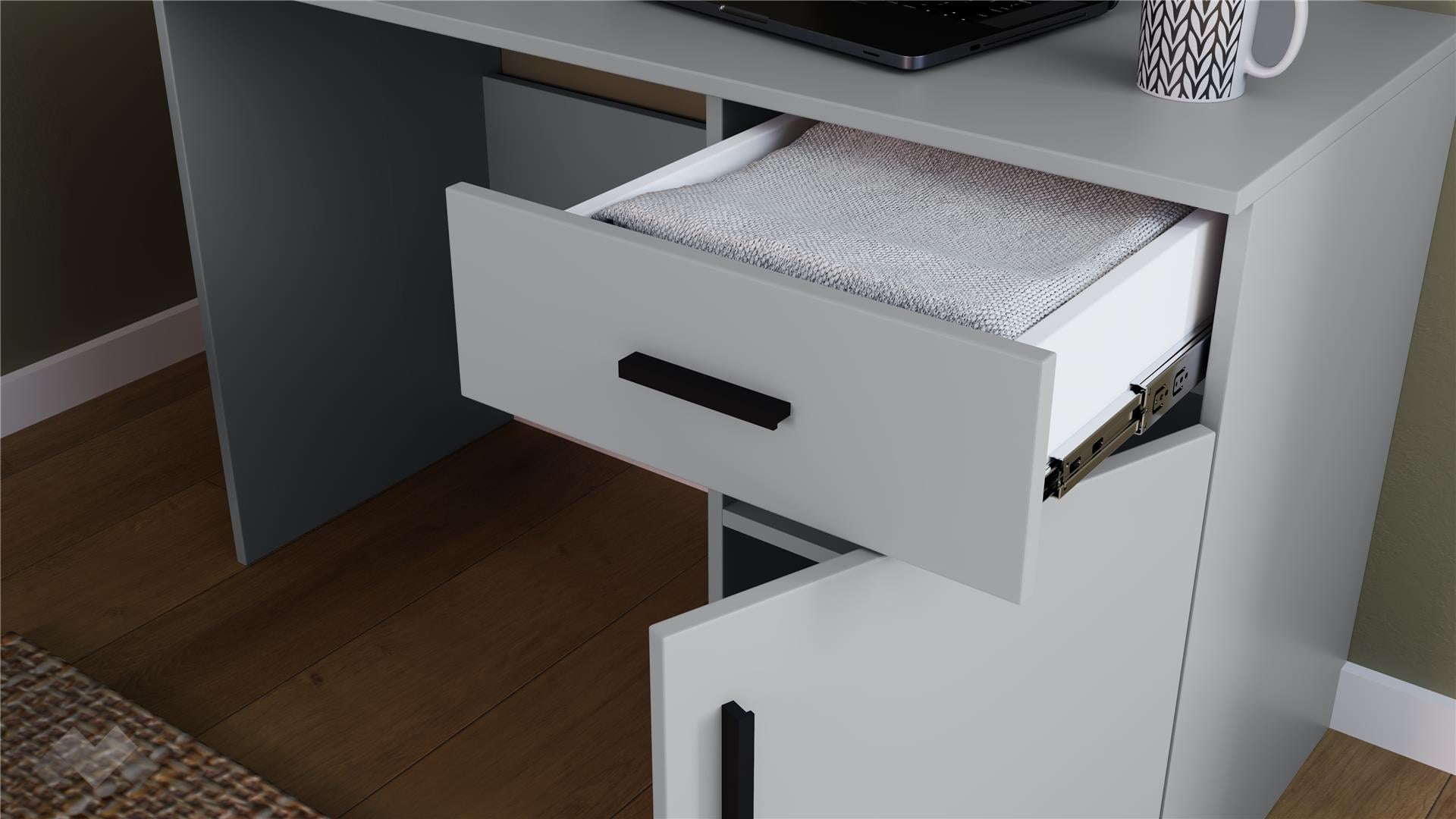 Бюрото разплага с чекмедже и с шкаф с вратичка. Отваряйки вратата на шкафа ще откриеш удобен вътрешен рафт, което ще ти осигури оптимално използване на пространството. Плотът е достатъчно широк, за да можеш да поставиш лаптоп или настолен компютър, но и в същото време ще остане място за декорации или други необходими вещи.